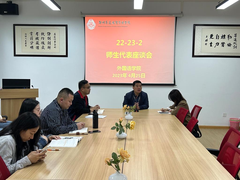 4月25日上午,外国语学院在学院206会议室召开了本学期期中师生座谈会。学院党委书记石皓召同志,教学秘书祁胜利老师,各教研室教师代表和20级21级22级学生代表参会,共计五十多人。