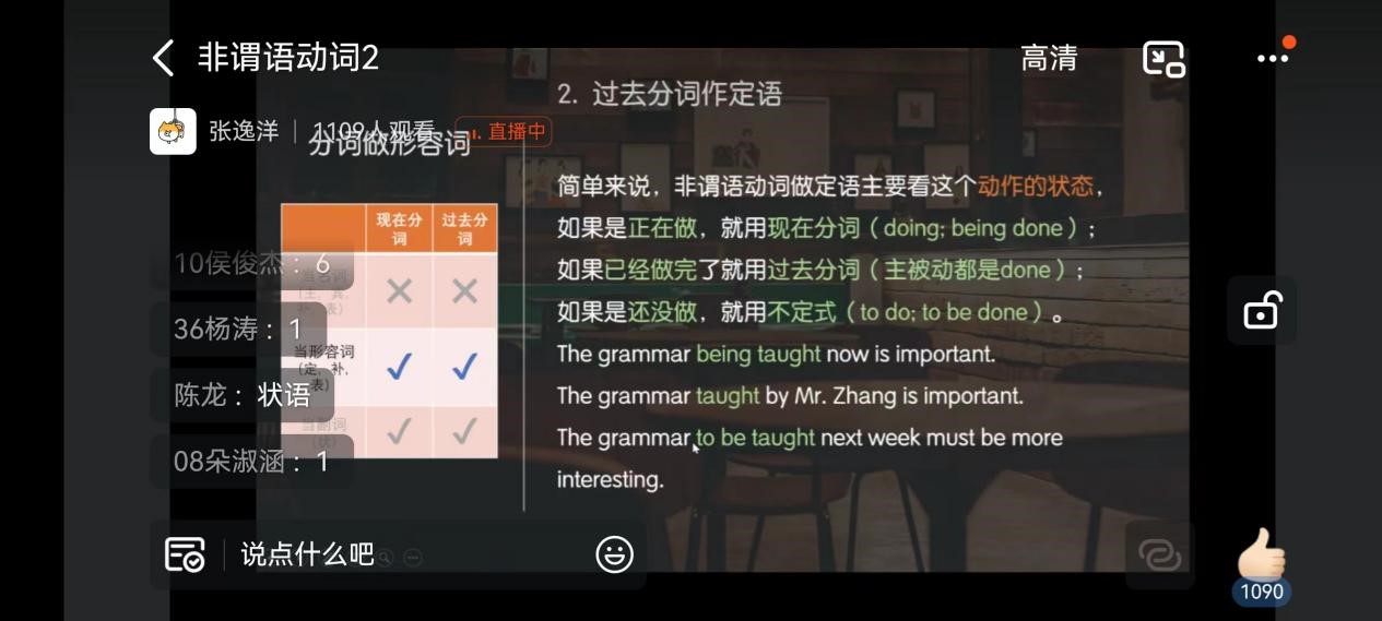 首先,张老师带领同学们通过示例回顾了上次语法讲座的主要内容,例如不定式和动名词的用法,帮助同学们加深印象并引出了本次语法讲座的主要内容:现在分词和过去分词。