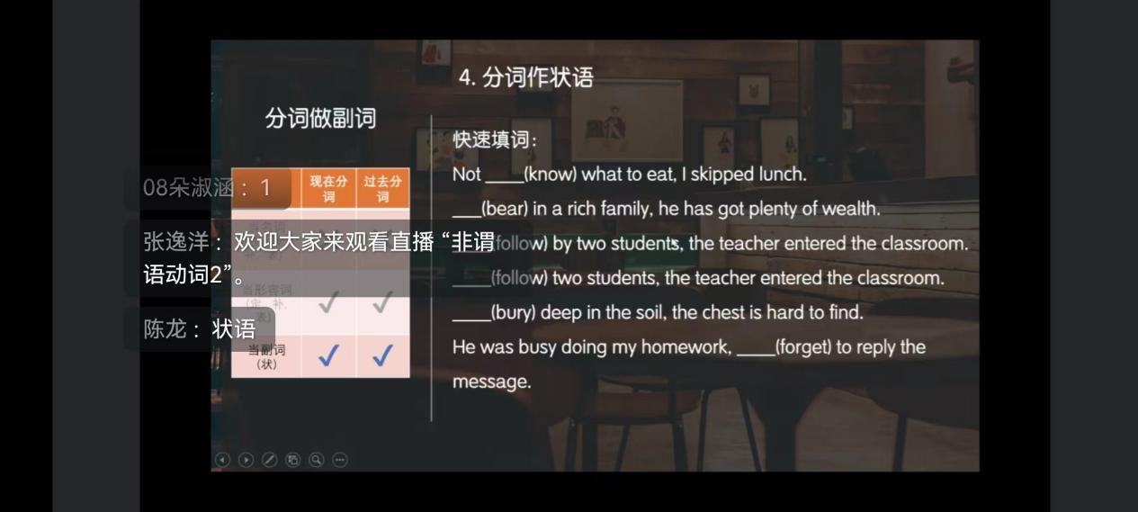 其次,张老师详细讲解了现在分词作定语和动名词作定语,过去分词作定语,分词做补语或表语以及分词作状语。在讲解过程中,根据易混淆点和出错点,张老师着重强调了现在分词和动名词的区别,通过具体示例和互动帮助同学们理解了二者之间的不同。
