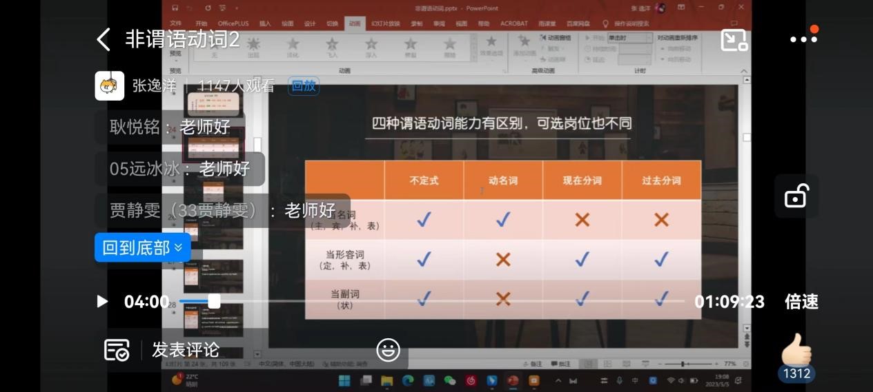 为助力2022级学生英语语法水平的提高,备战未来大学英语四级考试,基础部在5月5日晚19:00-20:30开展了英语语法系列专题辅导讲座第四讲,主题为非谓语动词,主讲教师为张逸洋老师。近1200名同学在线认真观看了本次讲座,本次讲座主要内容为非谓语动词中的现在分词和过去分词。