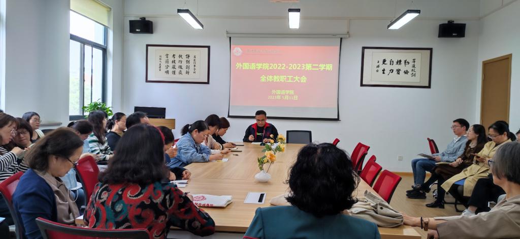 5月11日下午,外国语学院在教一楼206会议室召开了全体教职工大会,会议由教学秘书祁胜利主持,学院全体教师及辅导员参会。