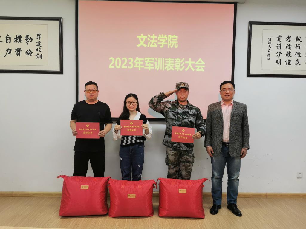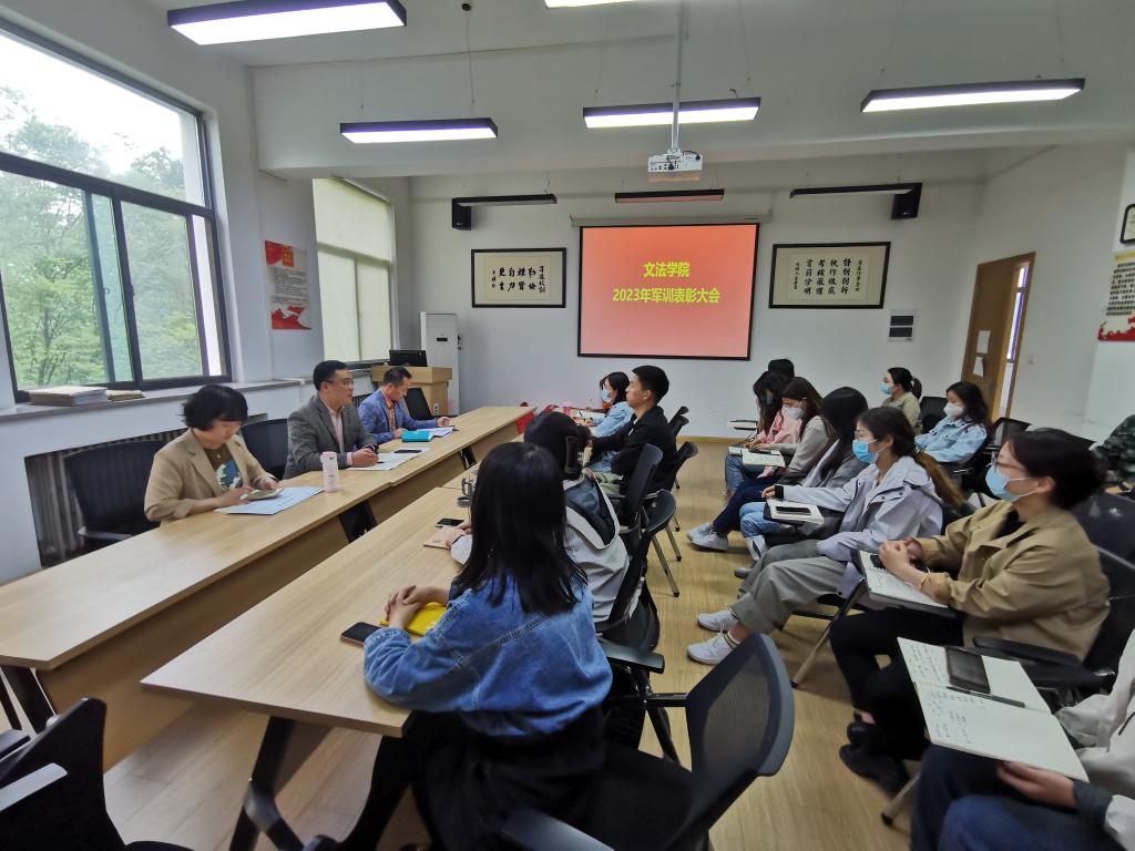“古之立大事者,不惟有超世之才,亦必有坚忍不拔之志。”2023级学生们在经过为期三周的军训后以优异的表现为军训画上了一个圆满的句号。5月9日文法学院对此次军训中表现优秀的学生、班级、军训教官和辅导员老师进行表彰。文法学院党委书记刘晓川、副院长赵严俊、全体辅导员老师及获奖代表参加会议。表彰会由行政秘书郑玲玲主持。