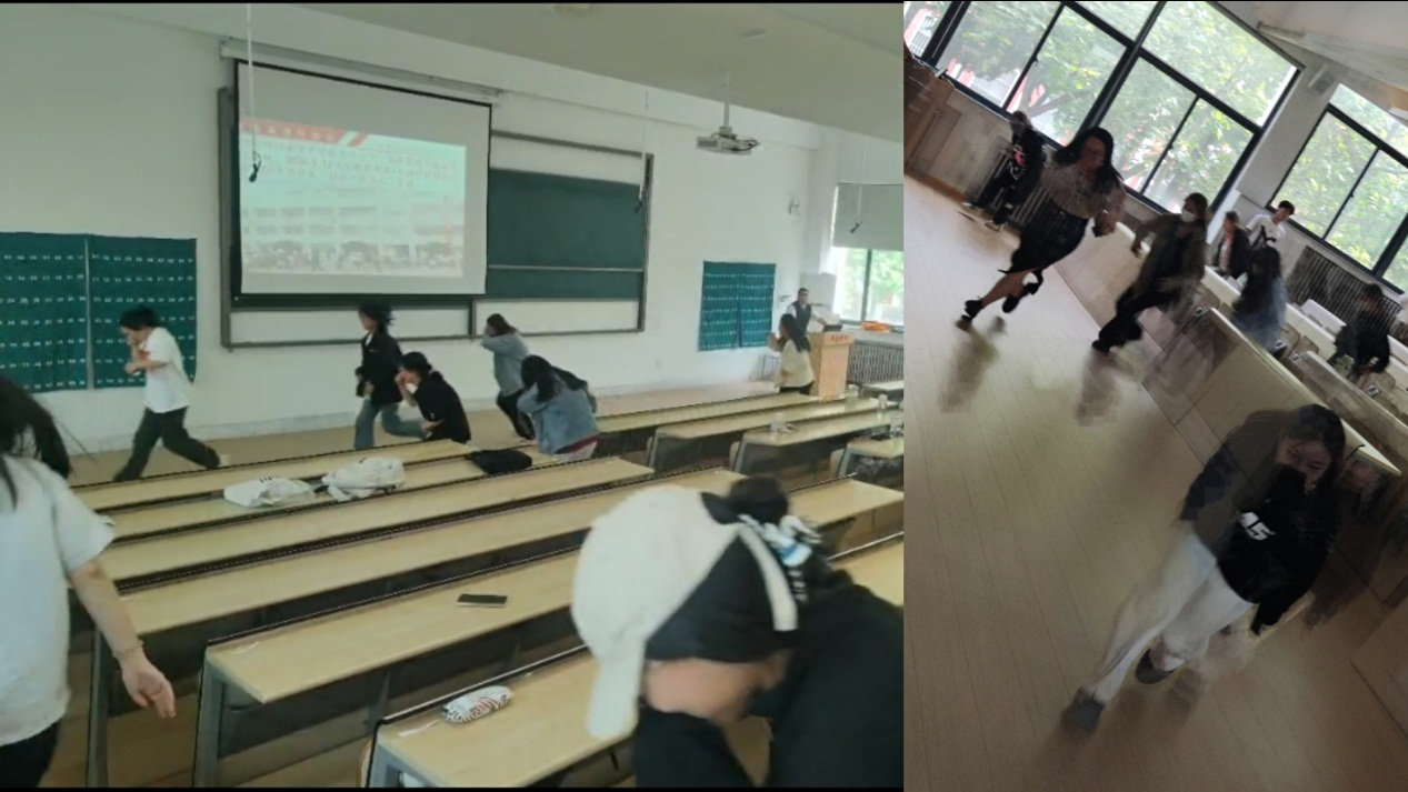 在演练环节,彭冲教员为大家讲解了正确的疏散逃生方法,学生们在老师的组织下,有序开展了疏散逃生演练。随着消防安全警报的拉响,学生们捂住鼻子和嘴巴,弯着腰,按疏散路线有序撤离,到达指定地点汇合。整个逃生过程当中,学生们做到了快速行走、无抢行、冲、挤行为,动作迅速,不吵闹,不慌乱。这次演练使同学们掌握了逃生的基本要领,深刻理解到逃生秩序的重要性。