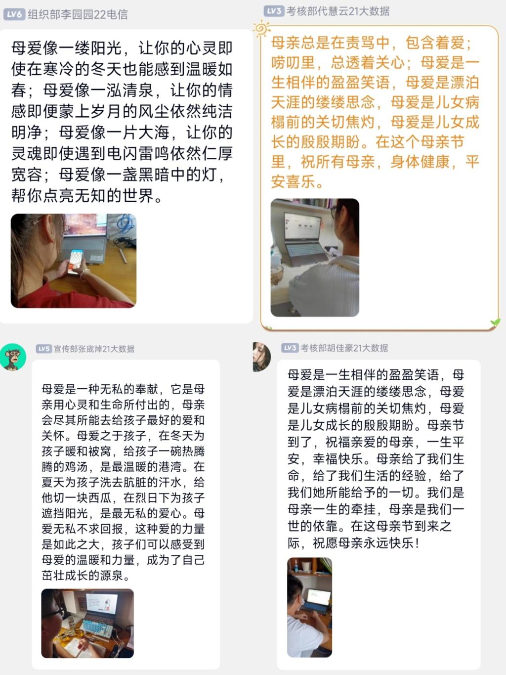 感恩是一种品质、一种修养、一种责任、一种动力!同学们发表的感言,字字含情,句句入心,让爱和温暖得以传递,让深藏内心的爱意被感知,让儿女们对母亲的诚挚祝福在这个美好的日子里得以表达。母亲节到了,祝愿我们所有伟大的母亲,节日快乐!永远幸福安康!