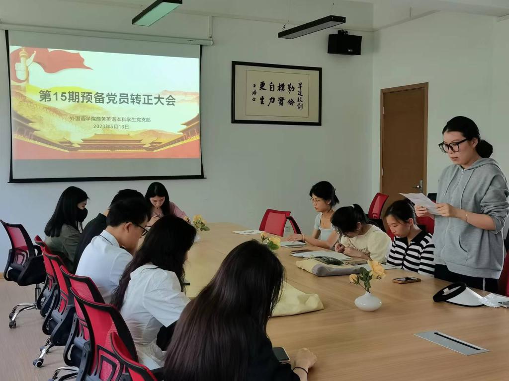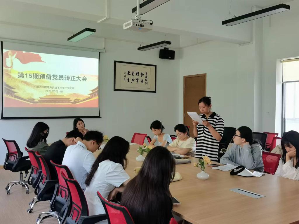 2023年5月16日中午,外国语学院商务英语专业学生党支部在院会议室1-206召开第15期预备党员转正大会,讨论关于王慧宇、李婉瑜等7名同志申请转为正式党员的事宜。党支部书记崔艳婷同志主持会议,支部全体师生党员参会。