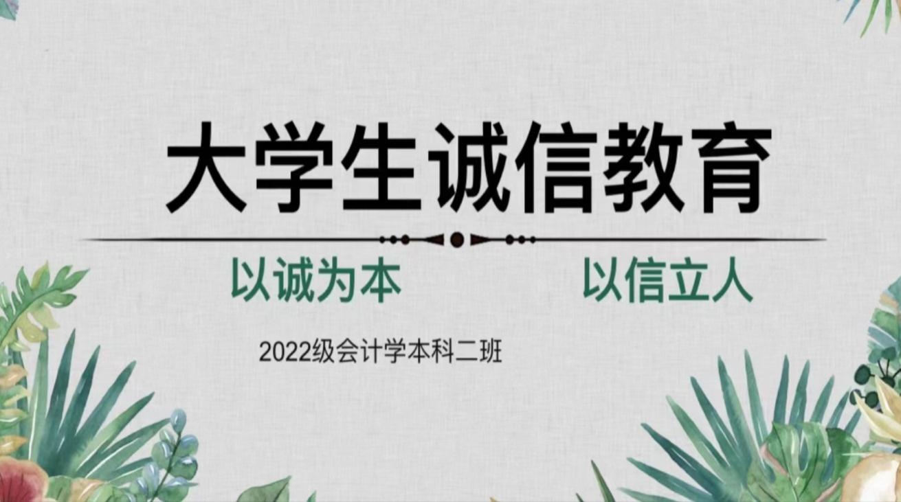 2022级会计学本科2班以《大学生诚信教育》为主题,以线上PPT展示和线下班会相结合的方式开展了此次宣传活动。会议从诚信是什么及重要性、国家助学贷款、诚信还贷、理性消费拒绝不良贷款四个方面进行了详细讲解。