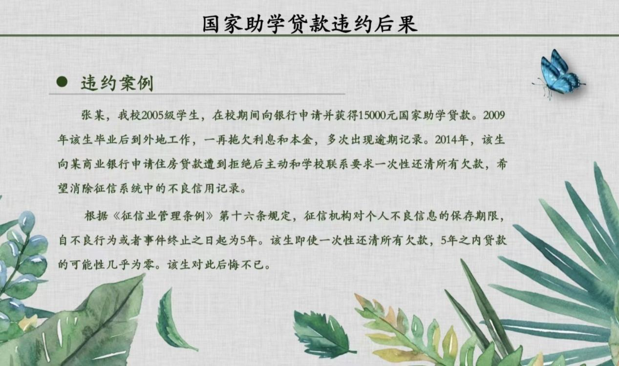 通过学习助学贷款相关知识,使同学们进一步了解助学贷款的目的;通过学习诚信还贷,为大家传播诚信还贷的原则和精神,使学生们逐步树立诚信意识,真正把诚信落到实处,把诚信转化为一种没有矫揉造作的意识使然。