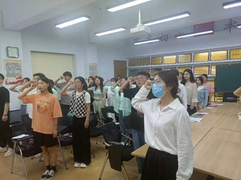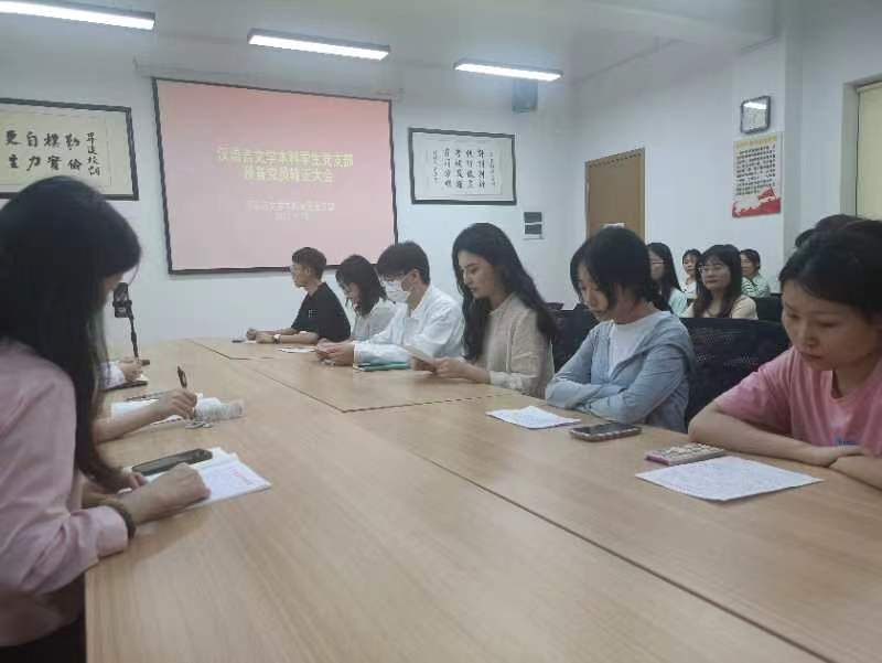 5月18日下午,文法学院汉语言文学专业本科学生党支部在教一楼314召开预备党员转正大会,支部书记张甜梦、组织委员孟醒、宣传委员王利利出席会议,党支部全体学生党员、预备党员参加。