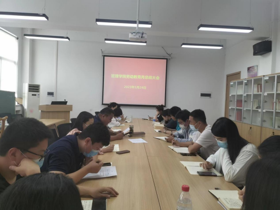 为大力弘扬劳动精神、劳模精神和工匠精神,大力培育和践行社会主义核心价值观,弘扬勤俭、奋斗、创新、奉献的劳动精神,把劳动教育纳入人才培养全过程,充分发挥劳动教育的综合育人作用,培养德智体美劳全面发展的社会主义建设者和接班人,管理学院于5月24下午16:20在教学2号楼305教室召开了劳动教育月总结大会,管理学院行政秘书许广庆和全体辅导员参加了此次会议。