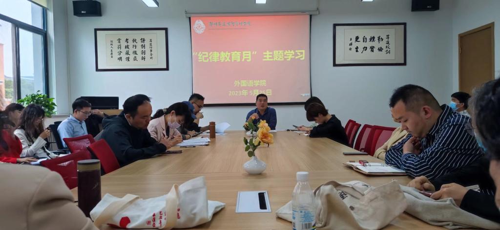 按照学校“纪律教育月”活动要求,学院相关工作安排,5月25日下午外国语学院组织全体教职工在1号楼206会议室开展了“纪律教育月”主题学习教育活动。活动由学院党委书记石皓召同志主持并主讲,外国语学院全体教职工参加。