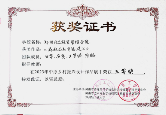 近日,在由河南省普通高等学校设计学类专业教学指导委员会、河南省艺术专业学位研究生教育指导委员会、新县人民政府主办,郑州轻工业大学、周河乡人民政府承办的2023年中原高校乡村振兴设计作品展评选中,我校艺术学院教师团队作品《森林公社幸福堤上》荣获三等奖。