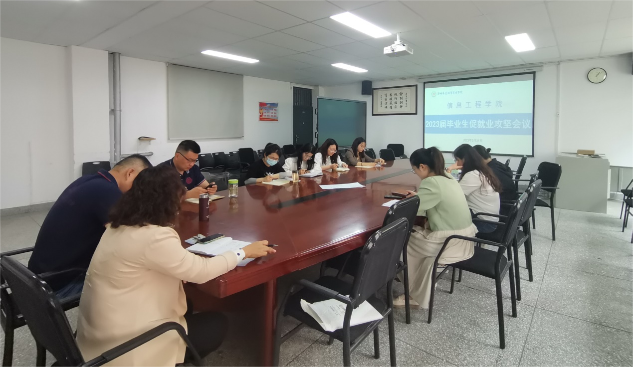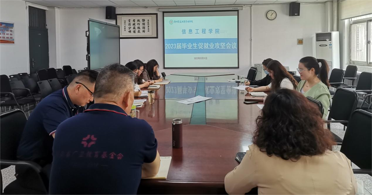 为了继续提高我院毕业生就业质量与就业率,保障毕业生顺利就业,尽早就业。信息工程学院于2023年5月31日在资讯楼104会议室召开2023届毕业生促就业攻坚会议。院长白鑫、党委书记张现水出席会议,行政秘书王崇主持会议,全体毕业班辅导员与就业专员参加本次会议。