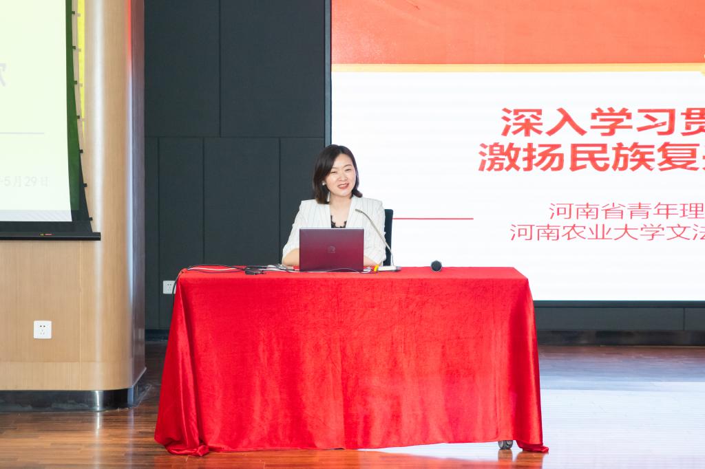 按照我校《学习贯彻习近平新时代中国特色社会主义思想主题教育实施方案》要求,为进一步增强全校广大党员、干部深刻理解、准确把握主题教育的重大意义,增强思想自觉、政治自觉、行动自觉,5月29日下午,河南省青年理论宣讲专家、河南农业大学文法学院党委书记牛娟老师莅校在双创大讲堂为我校学生党员讲了题为《深入学习贯彻党的二十大精神 激扬民族复兴中的青春之歌》的专题党课。