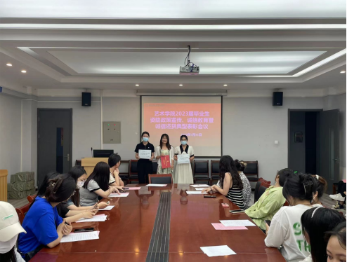 为更好的宣传资助政策,引导贷款毕业生心存感恩、信守承诺、守约还款,做好贷款毕业生贷后管理工作,5月31日,艺术学院在411会议室召开2023届贷款毕业生资助政策宣讲暨诚信还贷典型表彰会议。学院团委副书记杨萌玮老师及2023年贷款毕业生参会,会议由学院资助专员王丽丽老师主持。