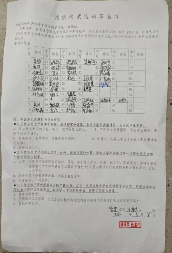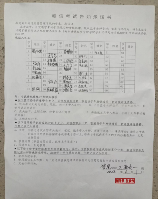 根据学校好学月活动的相关要求,在班会上辅导员带领学生学习了学校课堂管理规定,讲述了诚信考试对自己学业的重要性以及诚信对于个人成长成才、养成良好道德修养、未来踏入社会、走向工作岗位、做人做事的重要作用。学生党员和班干部应该起到模范带头作用,为建设良好学风和考风作出自己应有的努力。会后,所有学生在《诚信考试承诺书》上签字承诺,以展现努力学习、诚信考试、诚信做人的坚定决心。