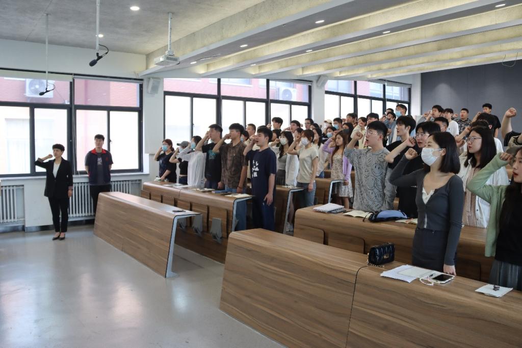 首先,武世鹏老师向各位毕业生党员传达学校关于党员组织关系转接的相关流程和规定,强调注意事项。随后钟江鸽同志带领毕业生党员举起右手,向党旗郑重宣誓,用激昂的声音重温入党誓词。“我志愿加入中国共产党,拥护党的纲领,遵守党的章程,履行党员义务……”,铿锵恢宏的誓词,强烈震撼着在场的每一位党员,一字一句,神圣而豪迈,体现了对中国共产党的无限忠诚和为共产主义事业奋斗终身的坚定决心。以铮铮誓言再言入党初心,以嘹亮之声表明报国之志。曾经入党时的情景历历在目,党员的责任意识、使命感和奉献精神再一次被点燃,党员们纷纷表示将牢记党员身份,不负学校期望、不负组织培养,勇担历史使命,坚定前进信心,努力成为堪当民族复兴重任的时代新人。