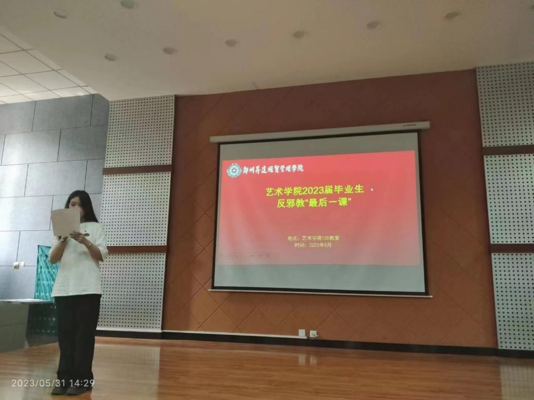 2023年5月31日,在艺术学院105教室为2023届毕业生开展了“学习贯彻二十大,崇尚科学树新风”为主题的反邪教教育活动。艺术学院党委书记张小雁、组织员刘世举及辅导员杨萌玮、阮宝洋、孙凤娟、李润蕊、马笑天、徐康康等老师参加本次会议。