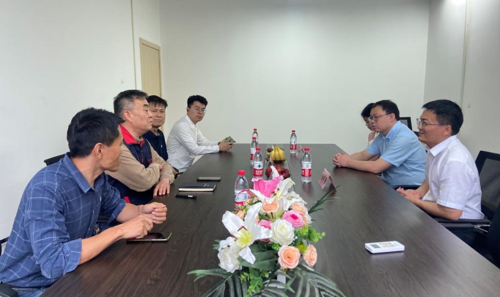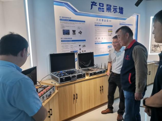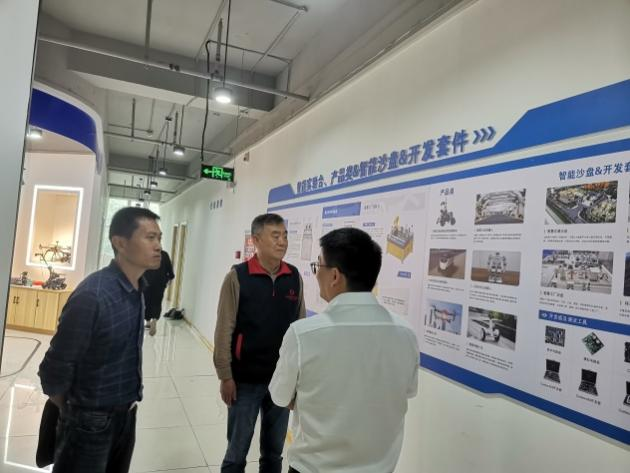 信盈达周中孝总经理、伦砚波经理接待访企团队,带领访企团队参观企业的科研成果。