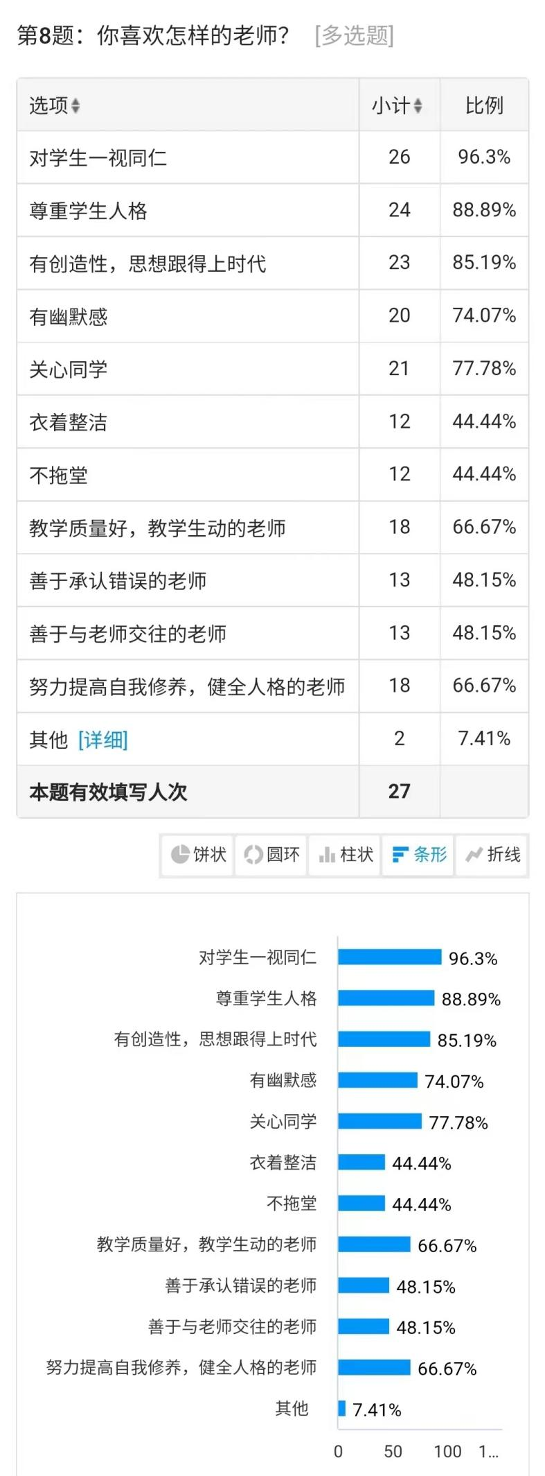 最后,针对学生喜欢怎样的老师展开调查,93.6%的学生喜欢对学生一视同仁的老师,88.89%的学生喜欢尊重人格的老师,85.19%的学生喜欢有创造性的老师,77%的学生喜欢有幽默感,关心学生的老师。