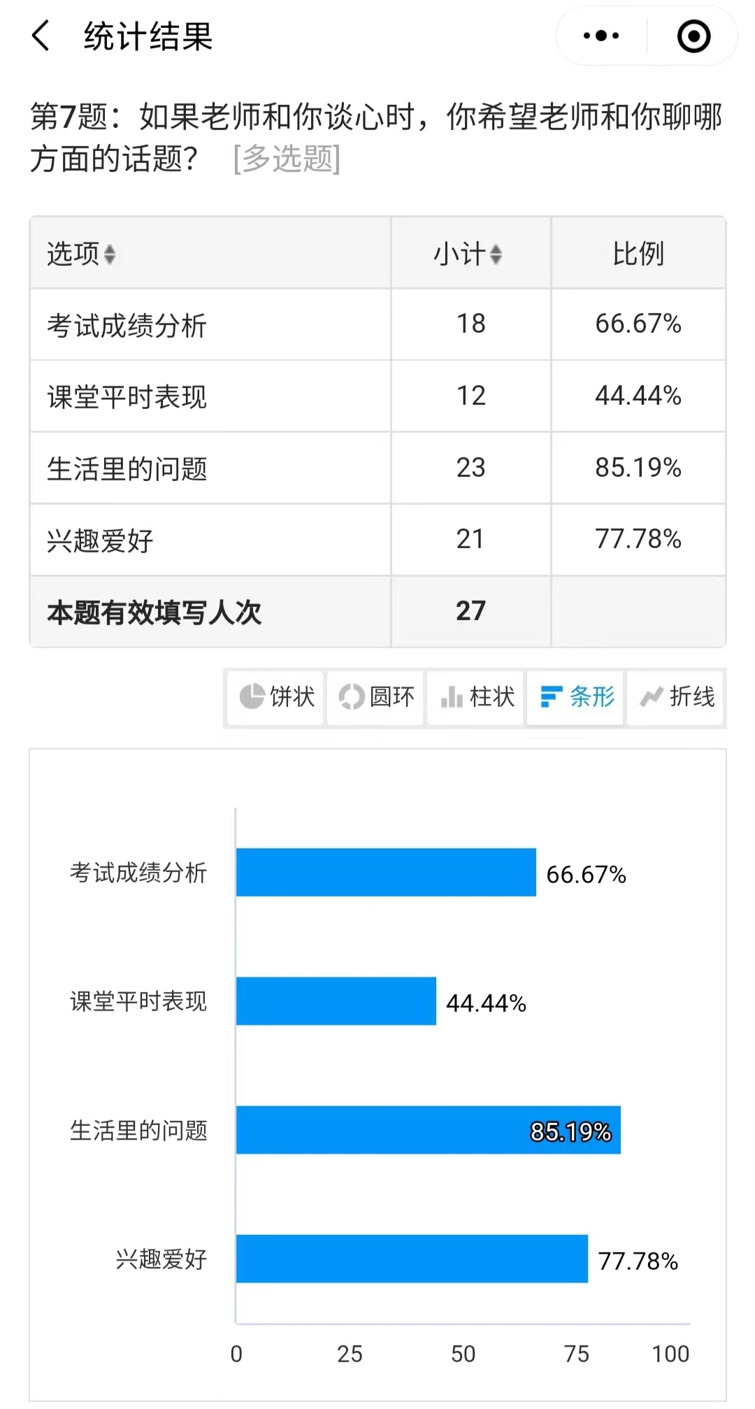 接着针对师生心理方面展开调查,85.19%的学生希望和教师谈论生活里的问题,77.78%的学生愿意和教师讨论相关的兴趣爱好,66.67%的学生都希望在和教师谈心时谈论考试成绩,44.44%的学生希望和教师谈论自己的课堂表现。
