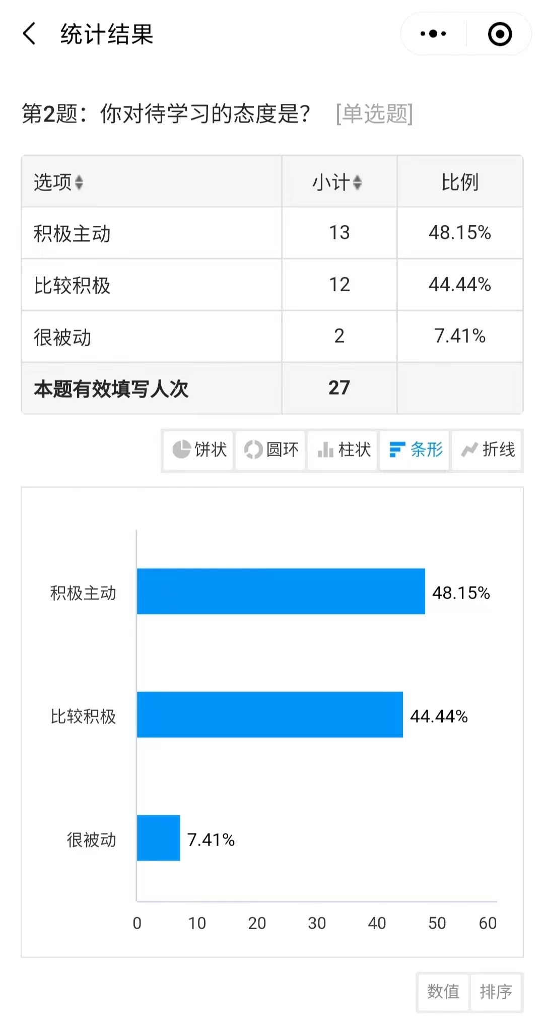 本次调查问卷分为三个方面,首先,由学生对待学习的态度进行展开,48.15%的学生对待学习的态度都是积极主动的,44.44%的学生对待学习的态度是比较积极,剩下7.41%的同学对学习是被动的。这三个数据表明绝大部分学生对待学习还是比较积极的。
