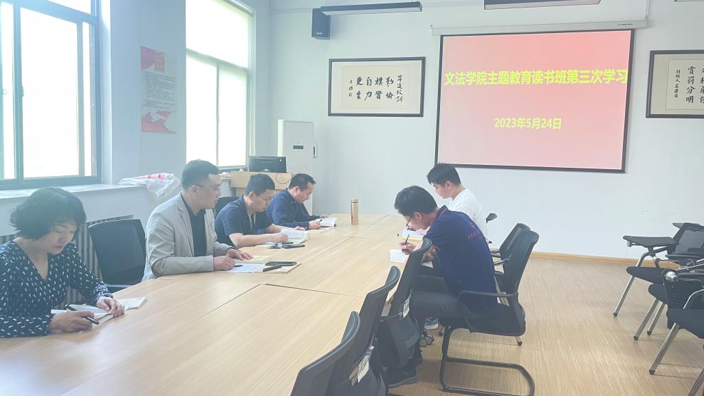 5月24日上午,文法学院在教学1号楼314会议室召开主题教育读书班第三次集中学习会,参加会议的有院党委书记刘晓川、院长段丰乐、统战委员兼教学秘书李南方、组织委员兼行政秘书郑玲玲、组织员金东亮,会议由院党委书记刘晓川主持。