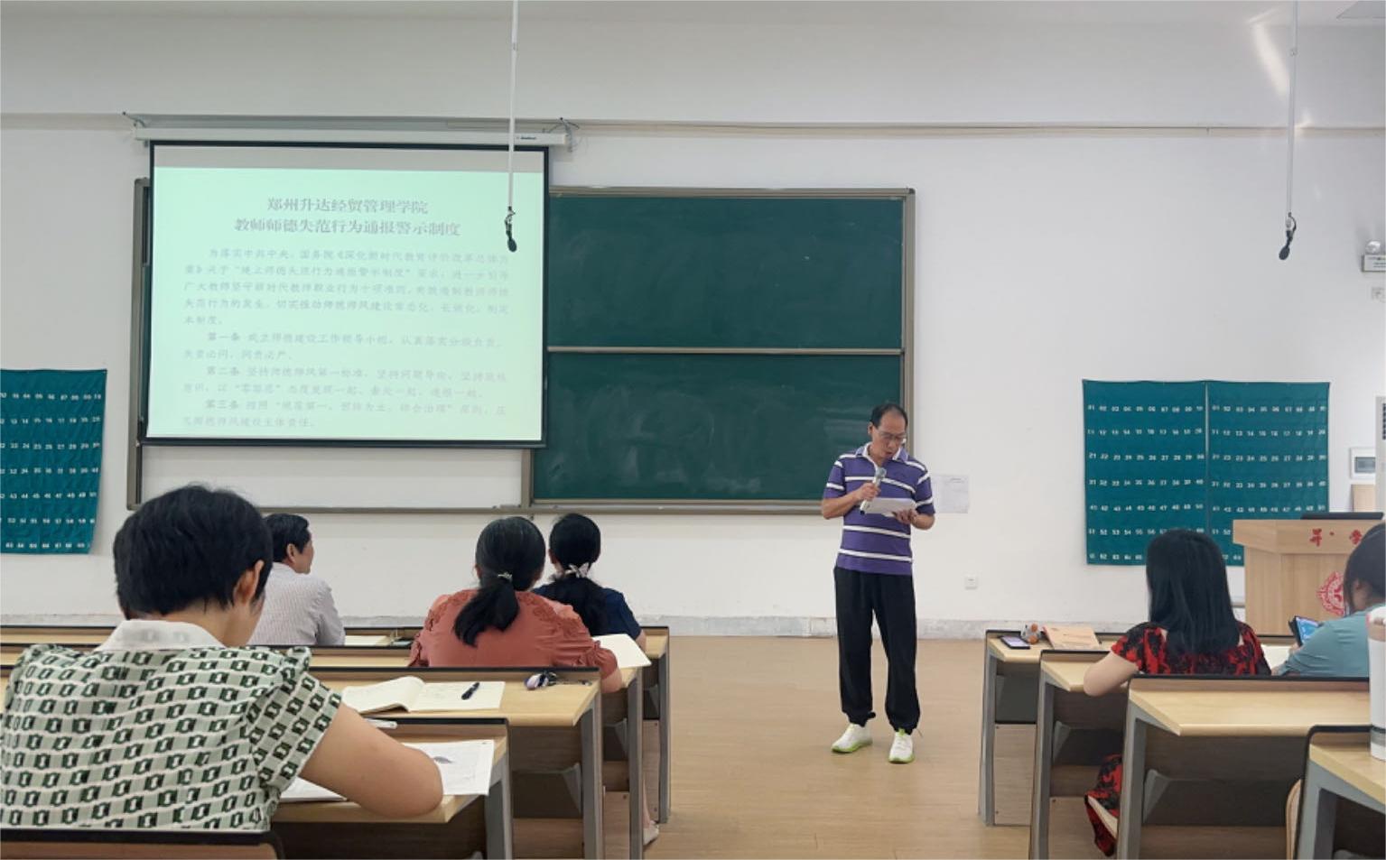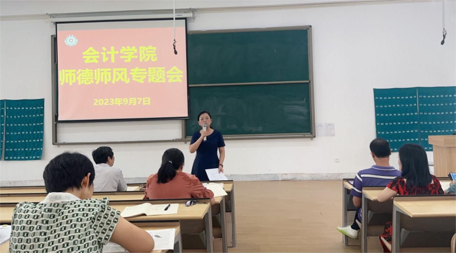 为进一步引导全院教师坚守新时代教师职业行为十项准则,推动学院师德师风建设,2023年9月7日,会计学院于教学4号楼118教室召开师德师风专题会,院党委书记张蕾,院长张景空,副院长毕鹏翾、张新成,行政秘书陈刚,教学秘书李永利以及全体教职工参加本次会议。