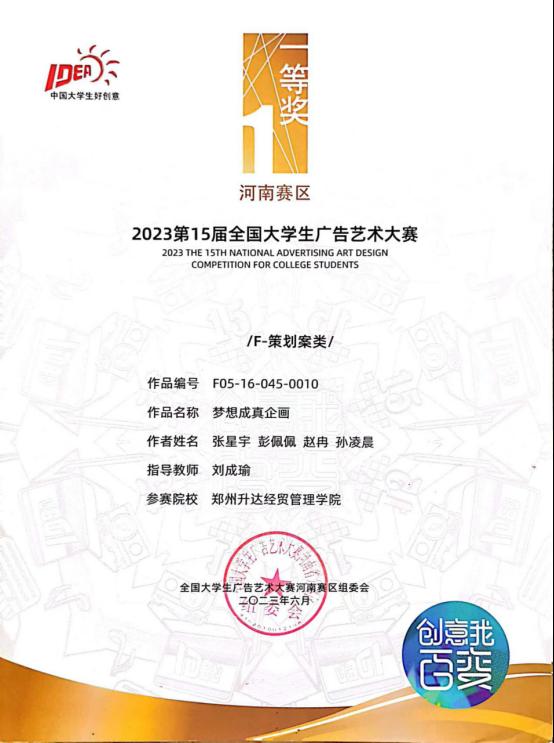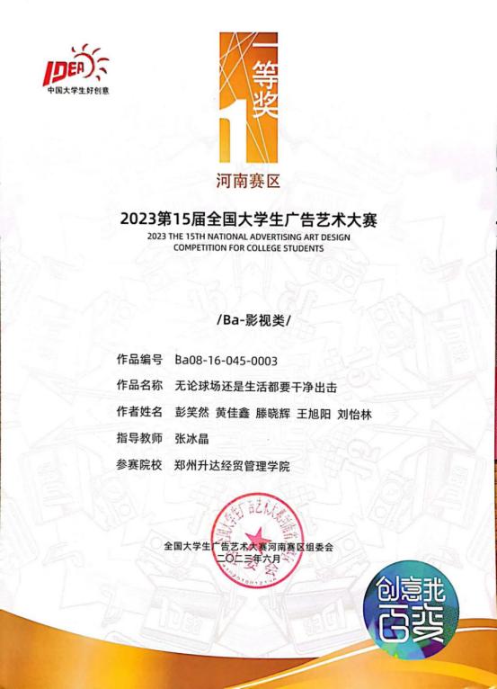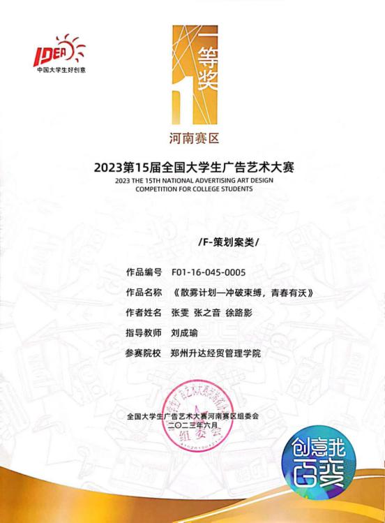 2023年第十五届全国大学生广告艺术大赛如期举办。经过学校初评、赛区评选、全国总评审,又历经为期10天的作品公示及信息核对,于9月6日12时公布获奖作品名单,经过激烈的角逐,商学院广告学专业共有29份作品获得河南省分赛区等级奖,其中一等奖3项、二等奖17项、三等奖9项;其中5份作品进入全国总决赛,获得全国优秀奖的好成绩!