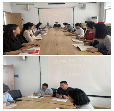 为开展严肃认真的党内政治生活,坚持党的思想引领,推动我们党实现自我净化、自我完善、自我革新、自我提高,9月14日下午2点,在2号教学楼315会议室,商学院组织召开党政联席会(扩大会议)。会议由商学院党委书记郭峰主持,院长白朋飞、行政秘书郗艳花及全体辅导员老师参加。