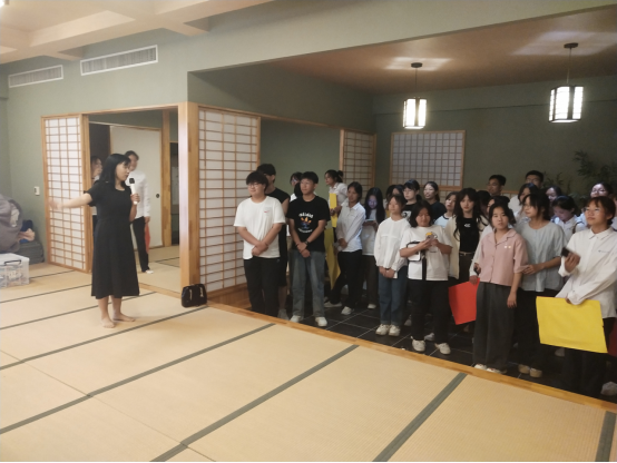 “开学第一课”结束之后,日语专业的洪艳荣老师、张真老师和赵宏涛又带领同学们参观了外国语学院的其他实验室。位于实训大楼A座6楼的英美文化室为咖啡厅设计,其中还有调酒吧台,开放期间各种酒水饮品可以点单畅饮。原版影视放映厅为小影院式设计,四周墙壁嵌入音响,环绕立体声效果非常好,体验了观影的同学们大为感叹。最后参观的日本文化室为和式房间,全室铺满榻榻米,除此之外包含壁龛、枯山水、拉门、日本茶室等众多日本文化元素,集文化体验、日语交流及多媒体教学等诸多功能于一体。参观完实验室之后同学们对要在这里度过的四年大学生活充满了期待。