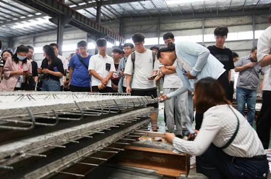 公司校外指导教师结合实际工程运用,详细展示讲解60mm厚桁架叠合板、预制围护墙、预制楼梯等装配式建筑构件生产工艺和技术控制要点,实操演示装配式水平构件连接方法,剪力墙结构外围护预制做法,预制构件节点构造要求,学院教师随后分组对同学们再进行细节讲解。通过理论联系实践、教学做一体化,同学们学习热情非常高涨。
