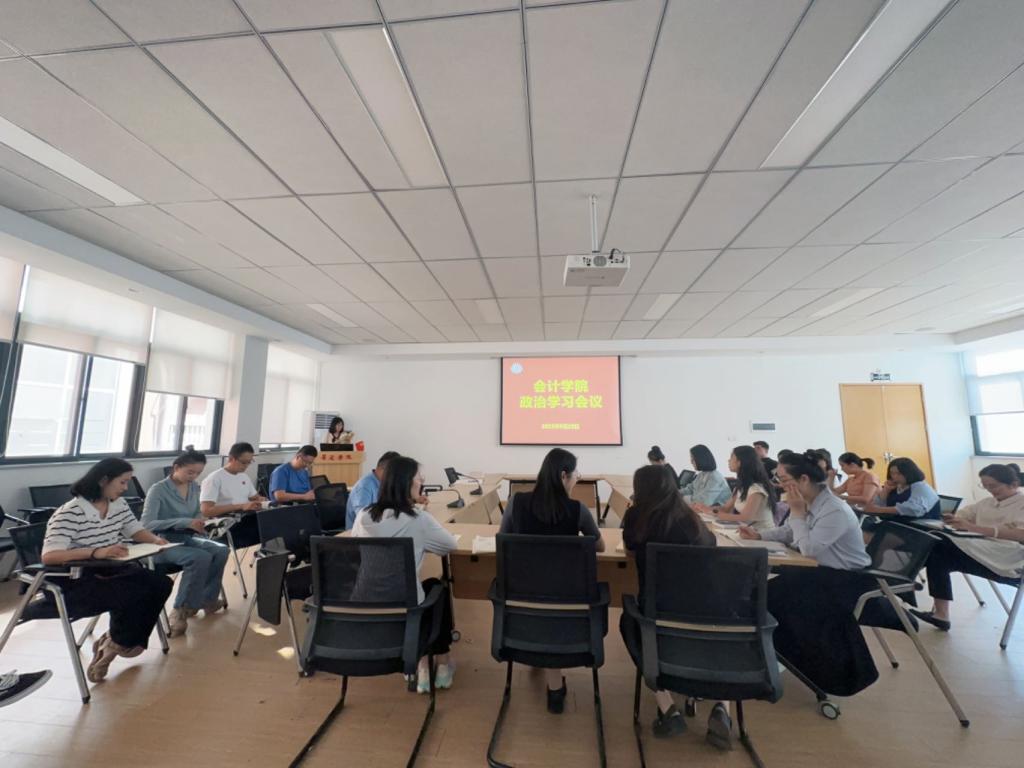 2023年9月22日,会计学院于4号楼209会议室组织集中政治学习。本次会议由院党委组织委员曹会美主持,行政秘书和全体辅导员老师参加。