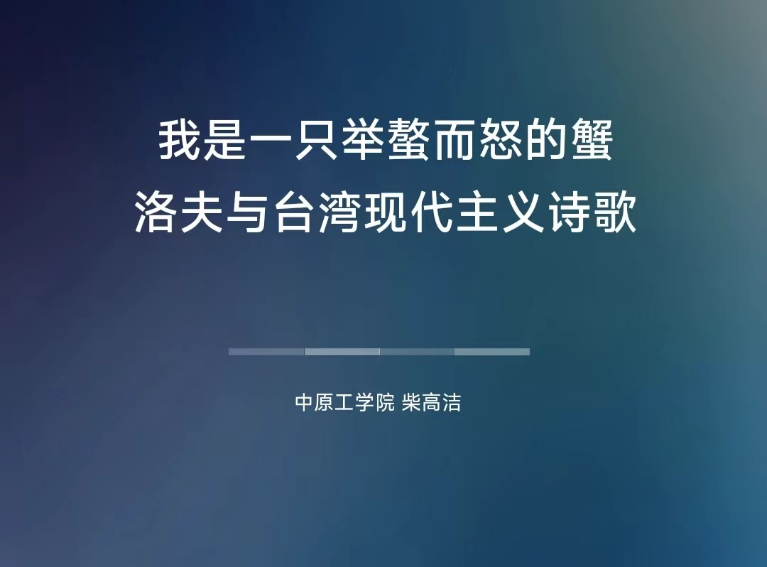 柴老师首先讲述了自己与台湾现代诗歌的缘分,表达了自己对台湾现代诗的喜爱之情,并分享了自己的研究之路。然后在介绍了许多同学们耳熟能详的台湾现代诗人后,柴老师重点展开了对洛夫与台湾现代主义诗歌的分析。洛夫原名莫运瑞、莫洛夫,1928年出生于湖南衡阳,1949年7月离衡随军赴台湾,中国著名现代诗人,有“诗魔”之称。柴老师结合洛夫诗歌创作的时代背景来分析其诗歌创作的三个不同阶段:魔之修炼——拥抱现代主义;魔之重生——对传统与古典的重估与反思;大中国诗观的提出与生命向晚之天涯美学。最后柴老师总结道,洛夫一直在诗歌的殿堂中求新求变,不管历史再怎么无情,地缘再怎么相隔,黑眼睛黄皮肤的中华民族总有着血浓于水的情义,这都刺激并激发着诗人的创作理念。在台湾解严后,台湾诗人多次回到故土,到大陆访问,展开学术交流。他有着一腔浓郁的爱国之情,并指出中国现代诗歌应该“表现大中华文化心理结构下的民族性和以人道主义为依归的世界性”。