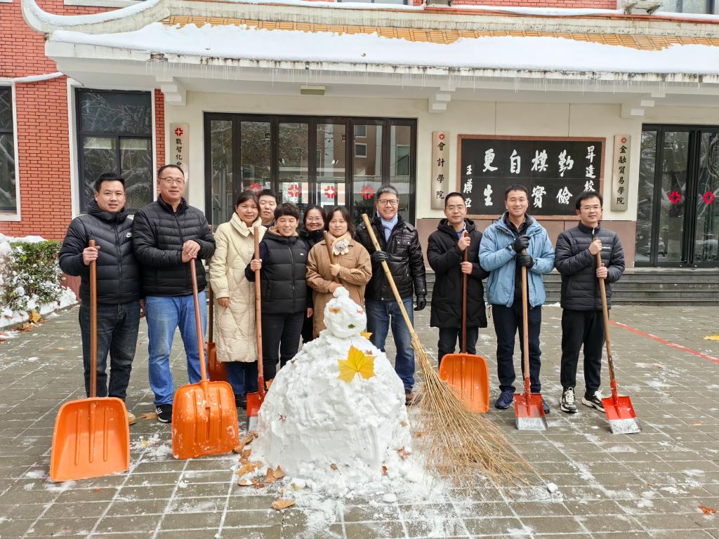 12月11日,晨起所见,便是“忽如一夜春风来,千树万树梨花开”。白雪如霜,照见人如画;雾淞沆砀,唯见松一痕。大雪带来了不可多得的美景也带来了诸多不便。为保障师生安全出入和教学工作正常运行,学院领导班子带头,全体老师积极加入扫雪队伍。