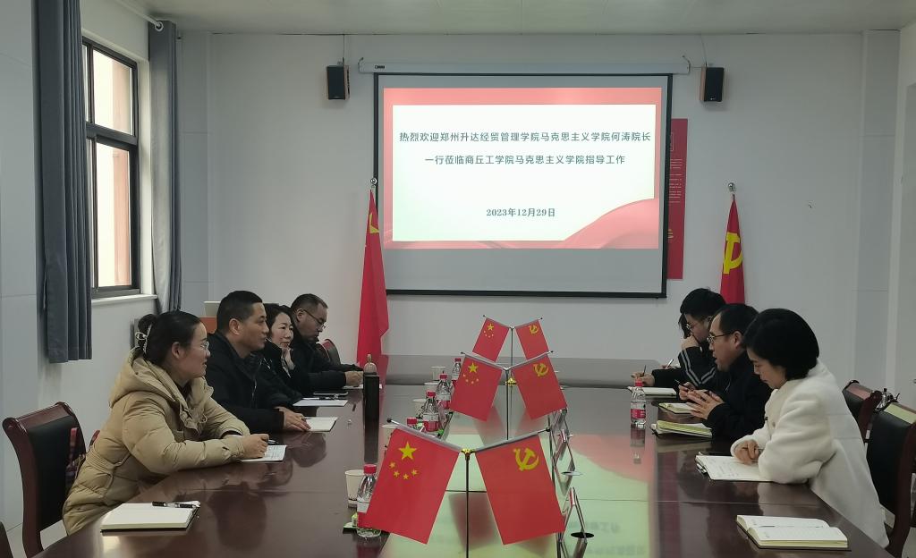 2023年12月29日,何涛副院长带领滕云、李瑛、姚立、李媛哲等教研室主任和教师代表对商丘工学院马院进行了调研观摩。商丘工学院马院崔浩书记重点介绍了示范性马院建设、教学改革、教师培训方面的经验做法,并引领参观了“信仰之路”生活馆以及马院的办公室、集体备课教室、智慧录播教室、资料室、教室阅览室等。最后,双方对口教研室老师又进行了深入的交流探讨。