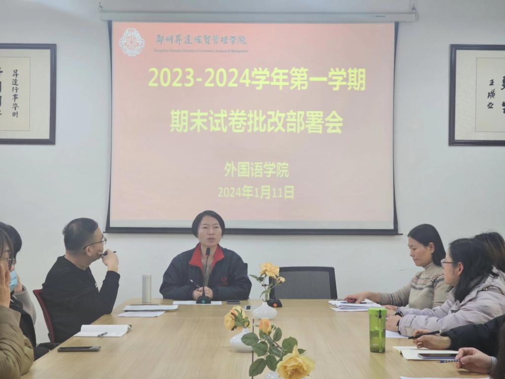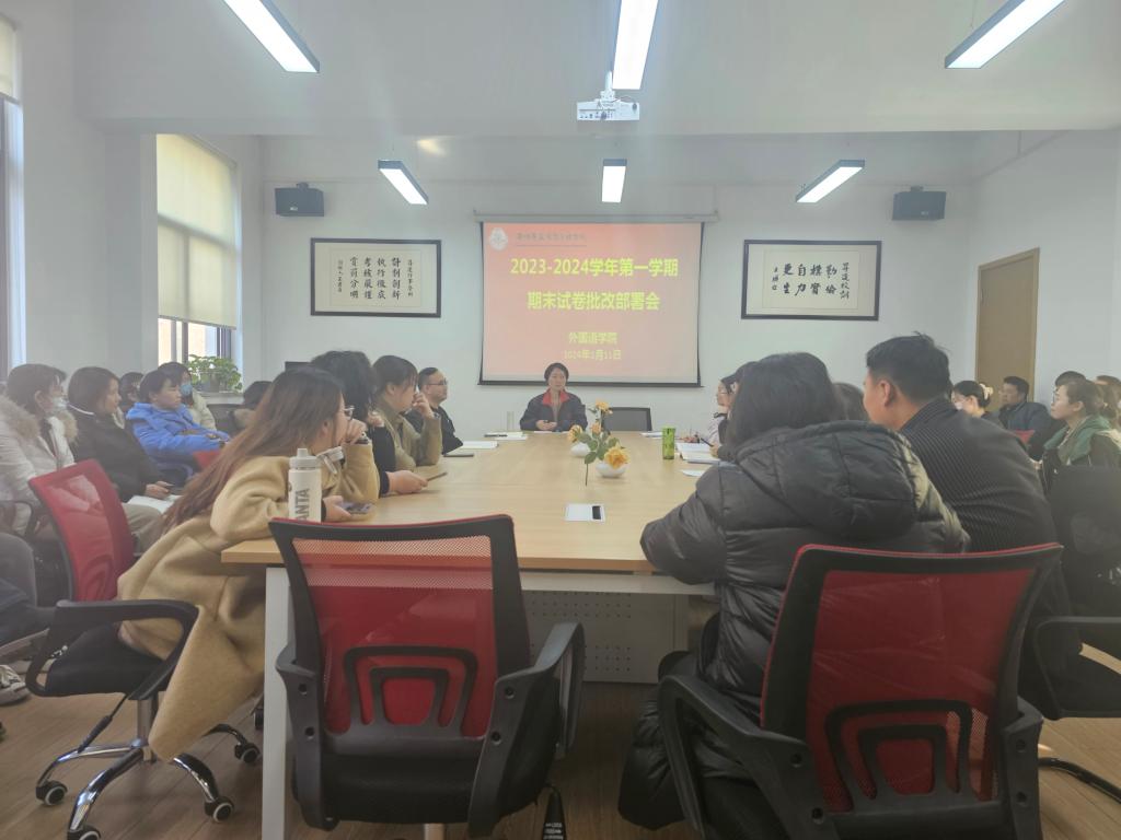 1月11日下午,外国语学院在教学1号楼206会议室召开本学期期末考试流水阅卷部署会。会议由外国语学院院长崔瑾英教授主持,学院全体教师参会。