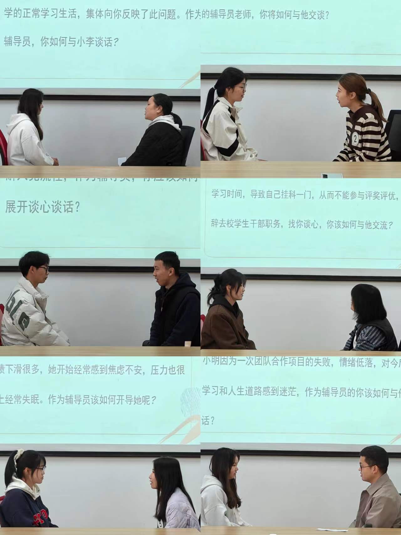在谈心谈话环节中,各位辅导员和各位学生,以情景再现的方式,在学生学习、生活、就业、创业等一系列相关问题开展了谈心谈话,并结合谈话情况进行总结,展现出辅导员对学生特征、学生成长成才规律的了解把握程度,以及辅导员对学生的教育引导能力、解决理论困惑和实际问题的能力。