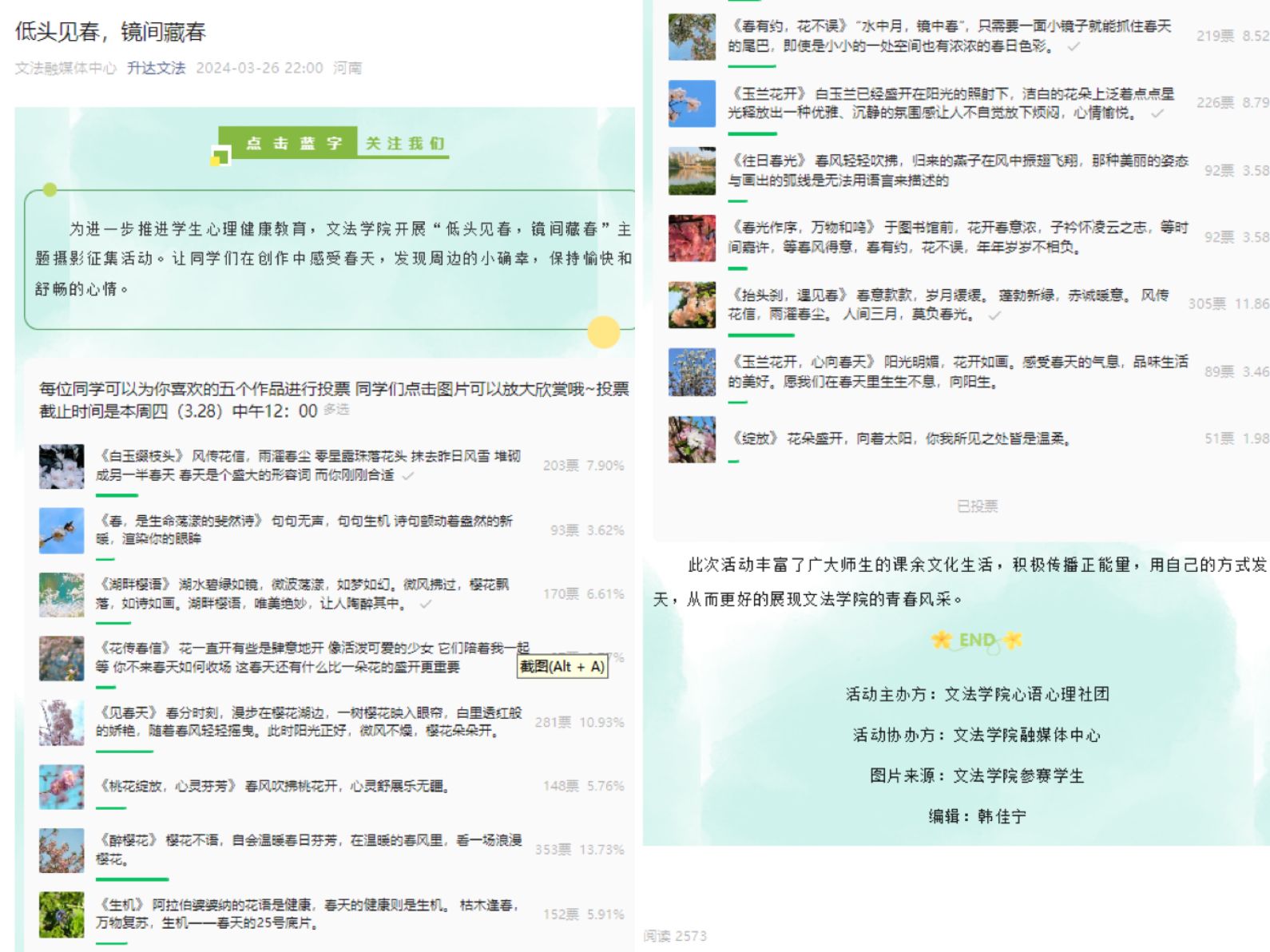 本次活动旨在让学生能够在创作中感受春天,用镜头记录春天,通过文案抒发对春天的期待和赞美,保持愉快和舒畅的心情,展现自己的风采。此次摄影征集活动得到了文法学子的积极响应,同学们踊跃参加,共征集到368幅学生摄影作品,经过初筛最终选出15幅优秀作品在“升达文法”微信公众号上发起线上投票,根据投票结果设立一等奖、二等奖、三等奖和创意奖若干。