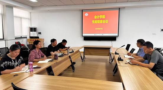 2024年8月27日,会计学院于4号楼209会议室召开本学期第一次党政联席会,会议对学院开学初相关工作及本学期的重点工作进行了研究布置。院长张景空,学院党委书记张蕾,副院长毕鹏翾、张新成,行政秘书陈刚,教学秘书李永利参加本次会议。会议由张蕾书记主持。