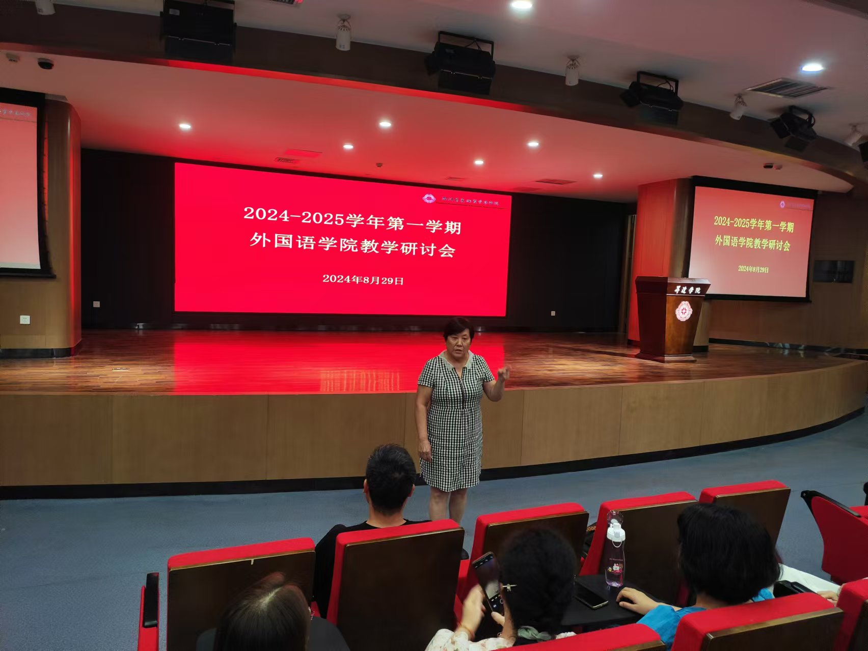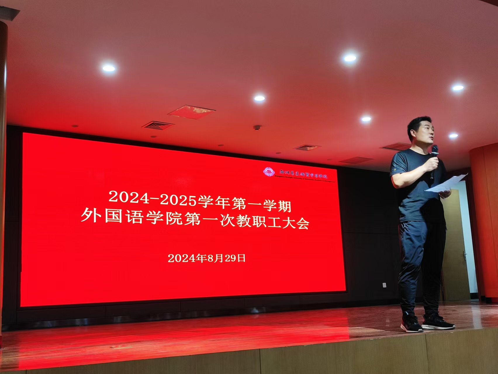 8月29日下午14:30,外国语学院在双创大讲堂召开2024-2025学年第一学期第一次教职工大会。会议由院党委书记石皓召主持,院长王莉莉、教学秘书、行政秘书以及全体外国语学院教师出席了会议。