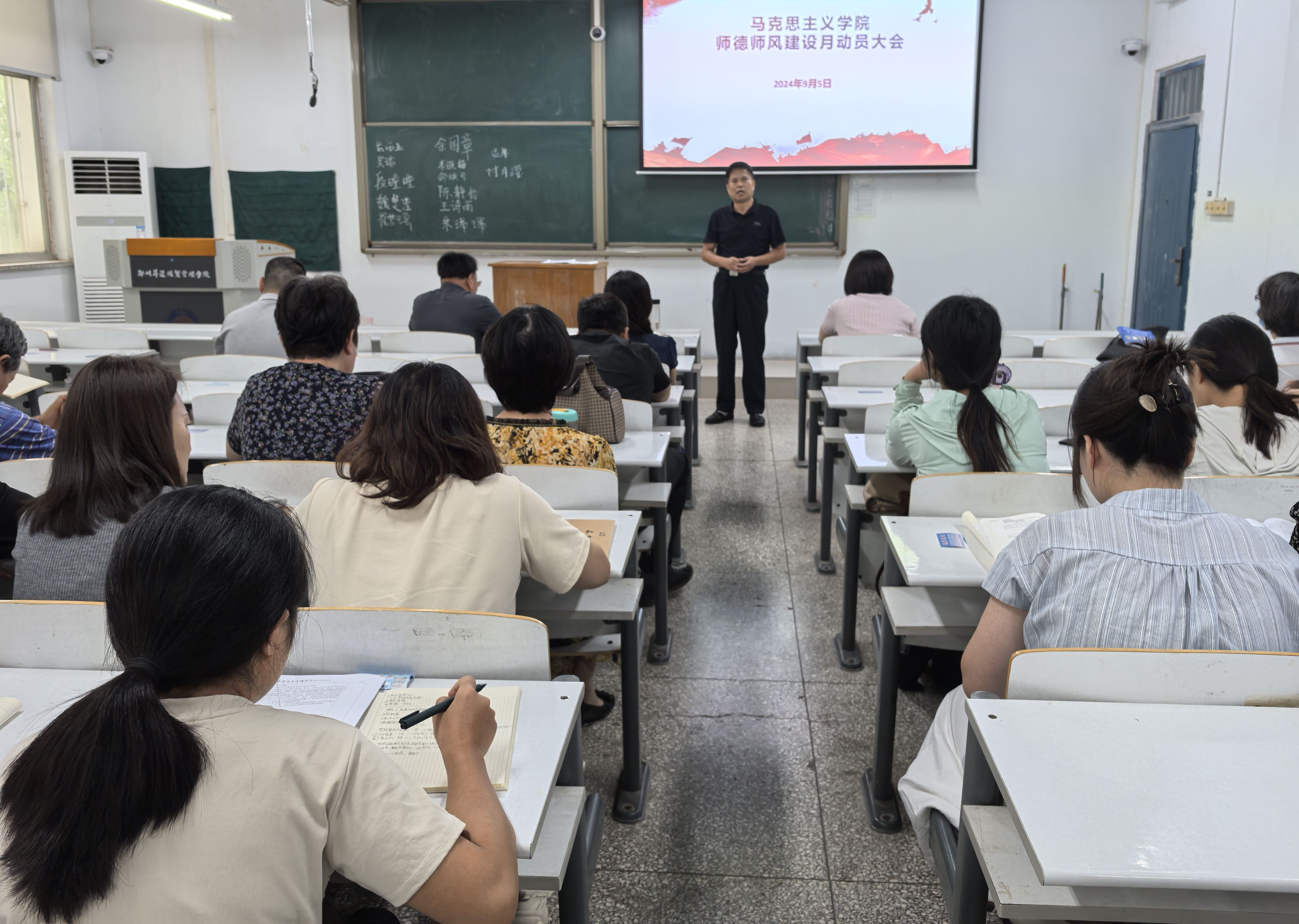 9月5日下午,马克思主义学院全体党员教师在综合楼207召开师德师风建设月动员大会,院长程明欣、党委书记窦峰、副院长何涛、教学秘书苗淑娟以及全体教师参加。