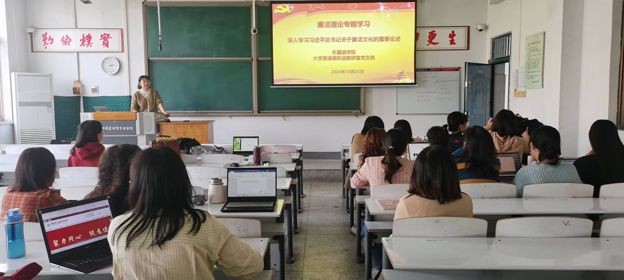 2024年10月25日中午,在综合楼322教室,外国语学院大学英语视听说教研室党支部召开廉洁理论专题学习,深入学习习近平总书记关于廉洁文化的重要论述。党支部书记宋玮主持会议,支部全体党员参加会议。党支部书记宋玮强调了在教师群体中开展廉洁文化宣传的特殊意义。教师作为教育工作者,肩负着培养学生品德和价值观的重任,廉洁文化的践行对学生有着深远影响,同时也是教师队伍保持纯洁性和专业性的必要举措。