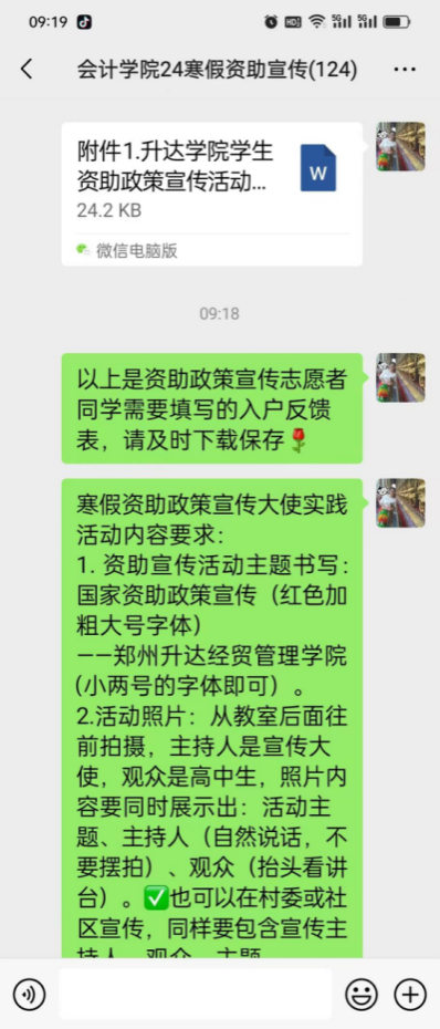 会后,我院随即组建了寒假资助政策宣传实践活动工作群,便于活动当中及时沟通细节和辅导答疑。相信在会计学院领导、老师和同学们的共同努力之下,本次寒假资助政策宣传活动一定会取得圆满成功。