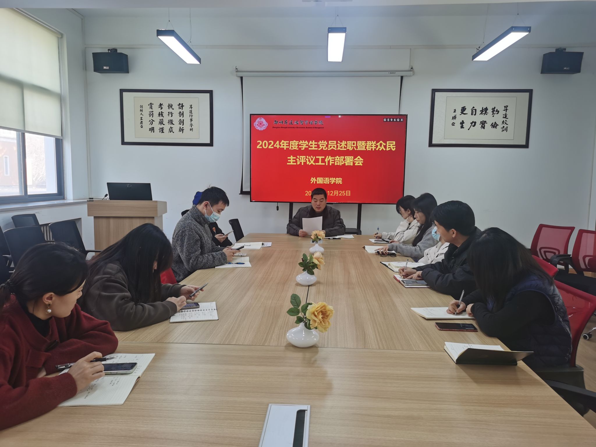 12月25日,外国语学院在学院会议室召开了2024年度学生党员述职暨群众民主评议工作部署会。会议由学院党委书记石皓召主持,全体学生党支部书记参加了此次会议。