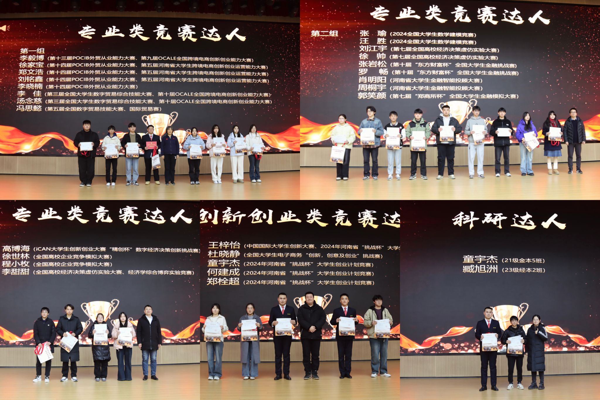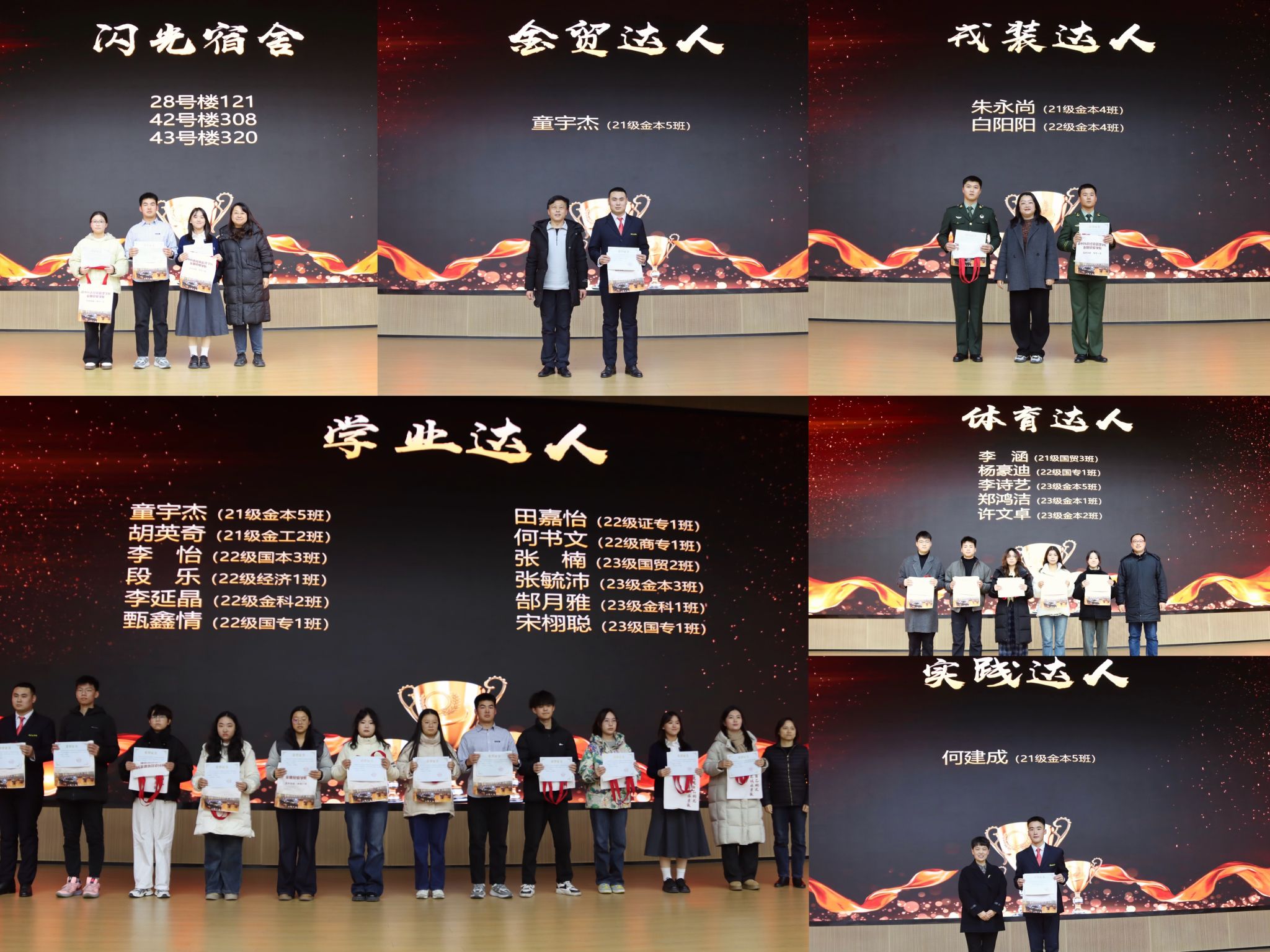 随着全体起立奏唱国歌,表彰大会正式开始。本次表彰大会共设立了多个奖项,包括专业竞赛达人、创新创业类竞赛达人、科研达人、体育达人、戎装达人、学业达人、实践达人以及金贸达人等多个奖项,涵盖了学生成长发展的各个维度,充分体现了学院对学生综合素质培养的重视。在主持人依次宣读获奖名单后,获奖学生们面带自信微笑,步伐坚定地走上领奖台。他们手中的荣誉证书和奖品在灯光下闪耀,那是他们努力与汗水的结晶,更是对未来征程的美好期许。每一位获奖者还与学院领导和老师们亲切合影留念,画面定格的瞬间,记录下的是师生共同的骄傲与自豪,也是学院学风建设成果的生动展示。