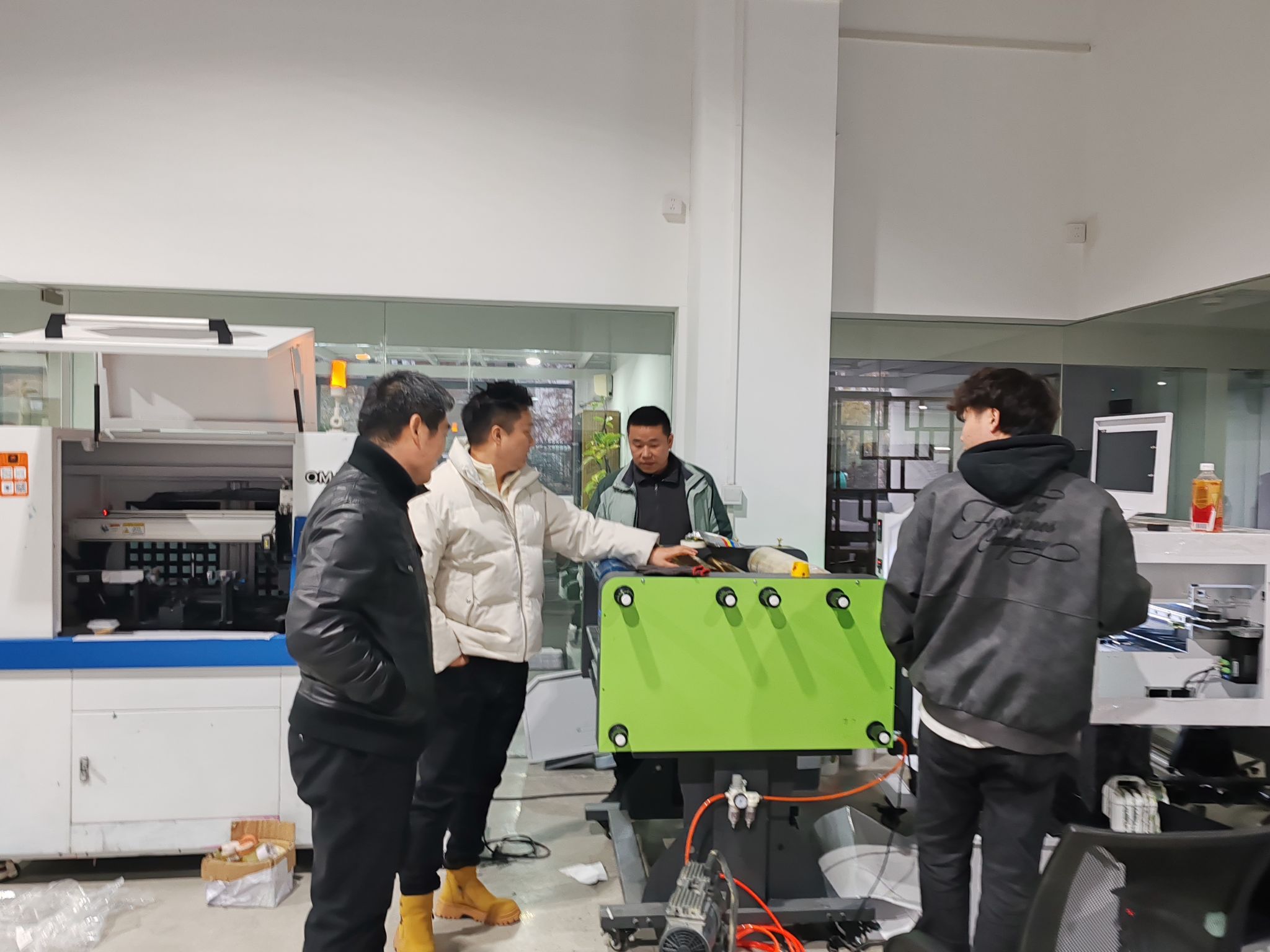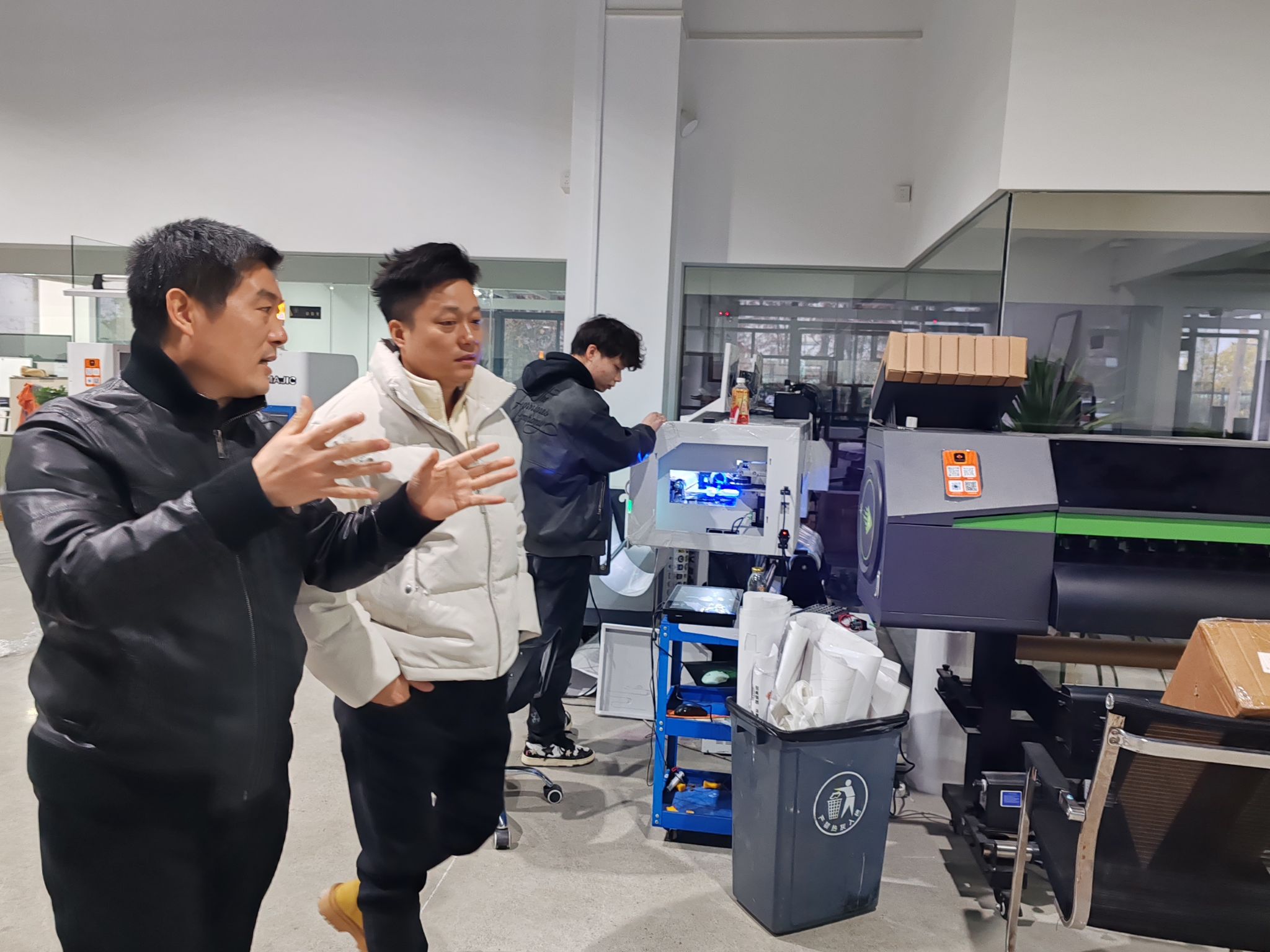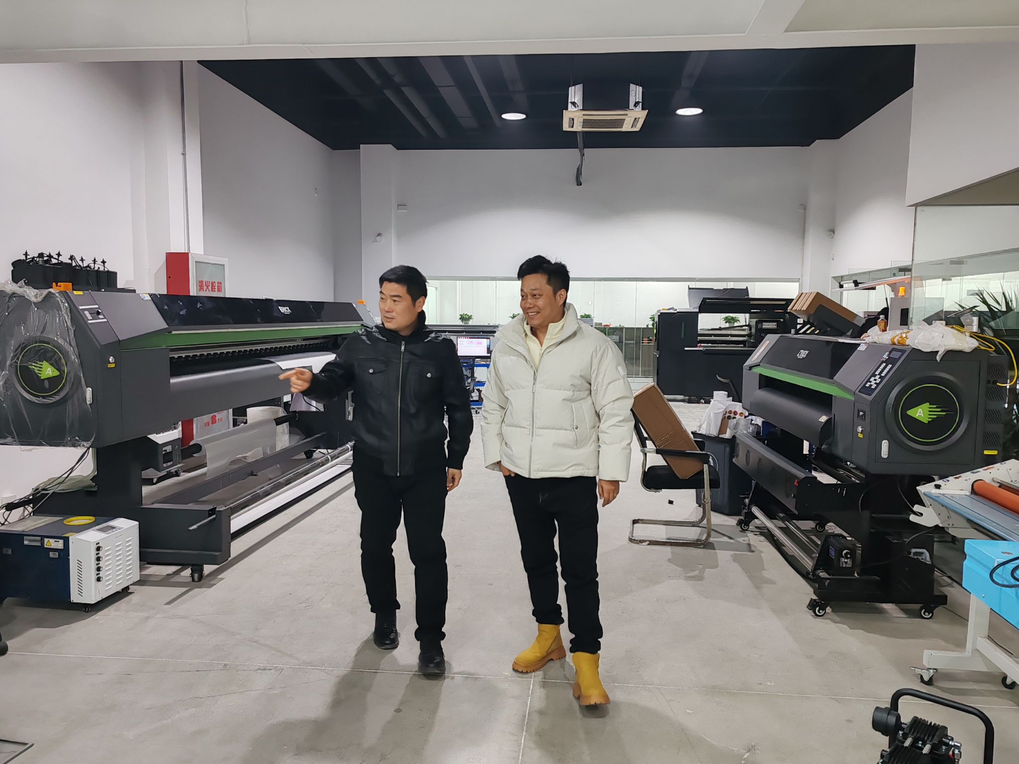 在付大喜校友的陪同下,石皓召书记一行首先参观了杭州艾利数码打印科技有限公司的产品展示车间。付大喜校友详细介绍了公司的发展历程、主营业务以及最新的技术成果。作为一家专注于数码打印技术的创新型企业,杭州艾利数码打印科技有限公司在行业内享有较高的知名度和影响力。