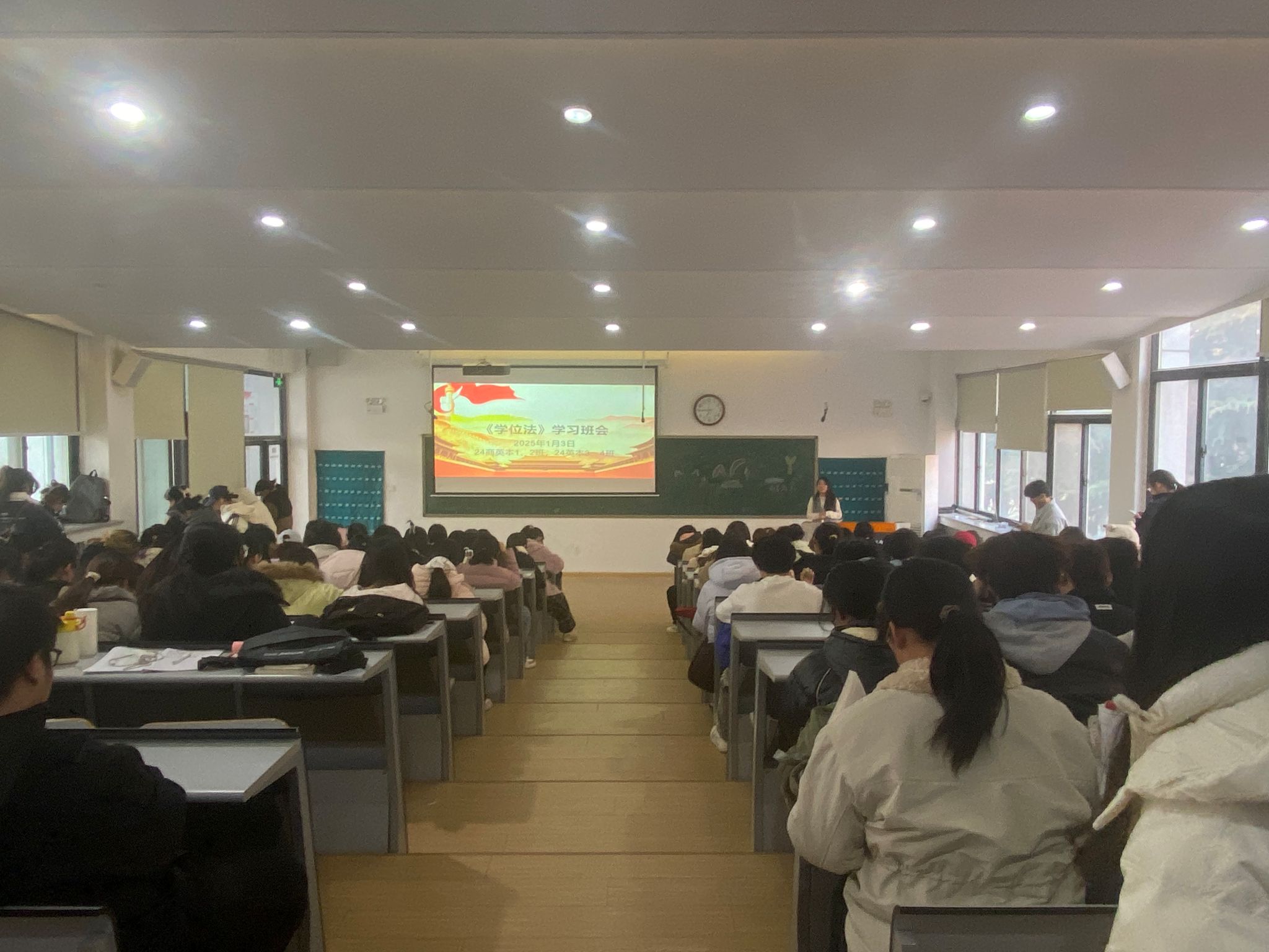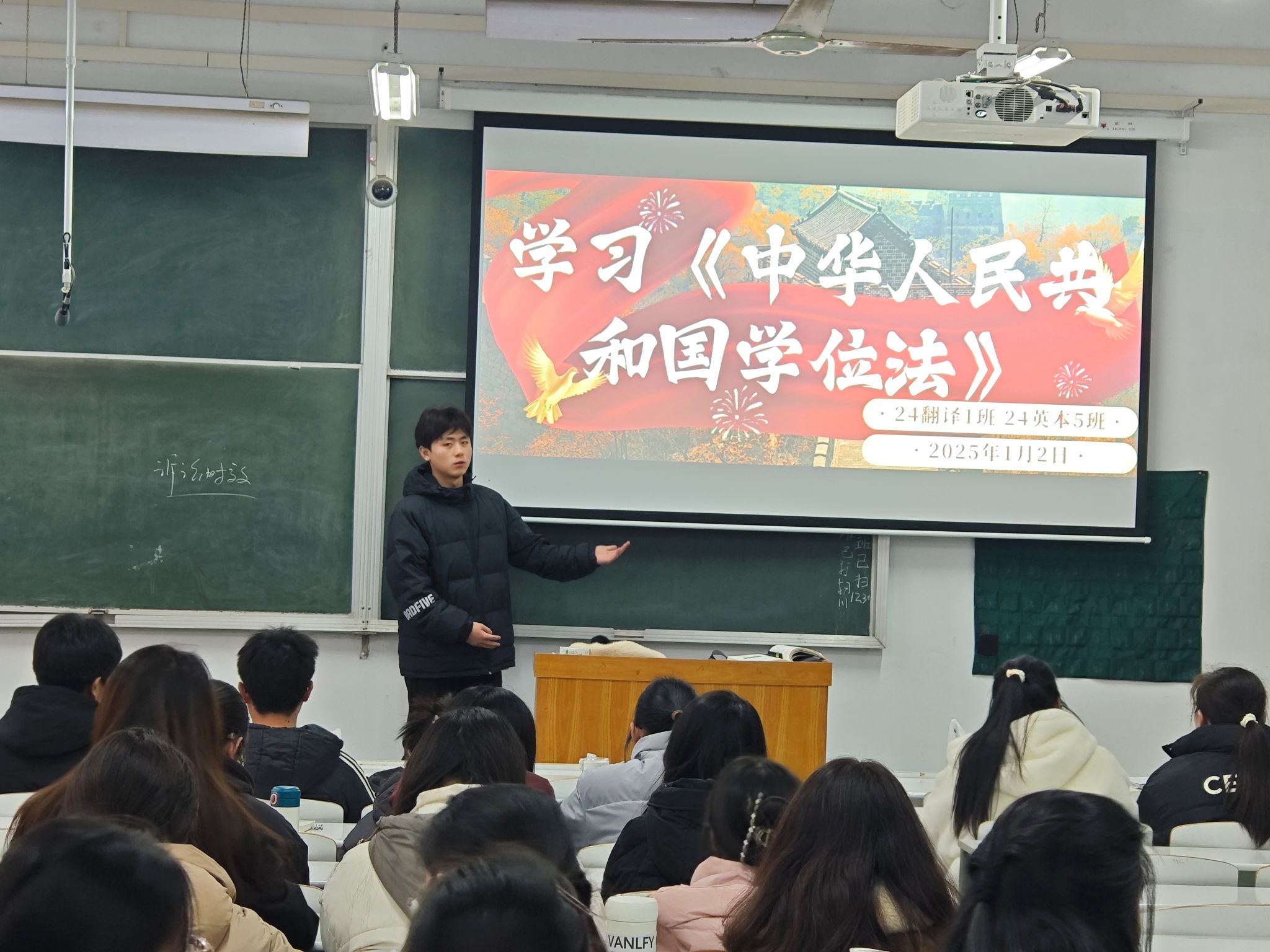 《中华人民共和国学位法》是规范学位授予行为、保障学位质量、维护学位获得者合法权益的重要法律,对于每一位怀揣学术梦想的学子而言,学好、用好《学位法》至关重要。近日,外国语学院辅导员组织各班学生聚焦学习《学位法》,旨在为学生们夯实学术根基,明确求学方向。各班学生怀揣对学术规范的敬畏,共赴这场意义非凡的法治学习之旅。