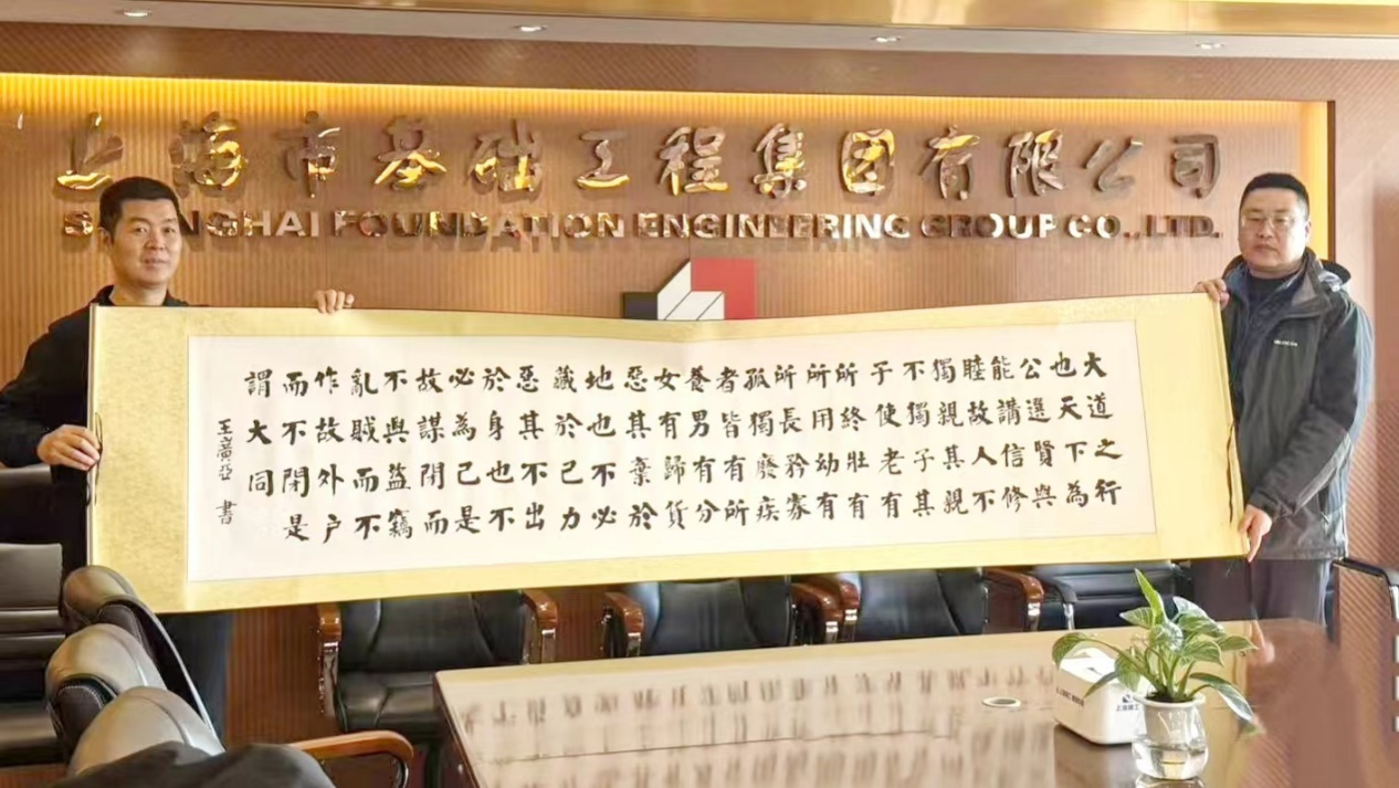 韩炎涛代表学校向上海市基础工程集团有限公司赠送了创办人王广亚博士的书法作品《大同篇》,向与会领导和校友赠送了创办人《书画作品集》、荣誉董事长王淑芳的作品《跨越海鲜两岸的教育实践家——我的父亲王广亚》、《梅花香自苦寒来》书籍和校友台历等礼品,表达了对上海市基础工程集团有限公司的大力支持与合作的诚挚感谢。他表示,双方的合作不仅加强了校企之间的联系,也为学校的发展注入了新的活力,期待未来能继续携手共进,推动更加广泛和深入的合作,并代表学校向企业和校友送上新年祝福。