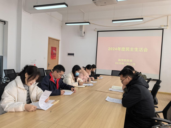 1月14日下午,商学院党委于315会议室召开2024年度民主生活会。学院党委书记郭峰主持会议,全体党委委员参加。