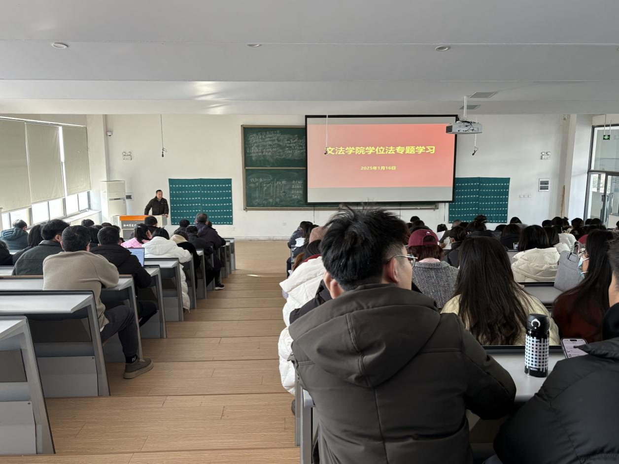 1月16日,文法学院在教学1号楼118教室召开学位法专题学习会,学院全体教职员参会,副院长赵严俊主持会议。